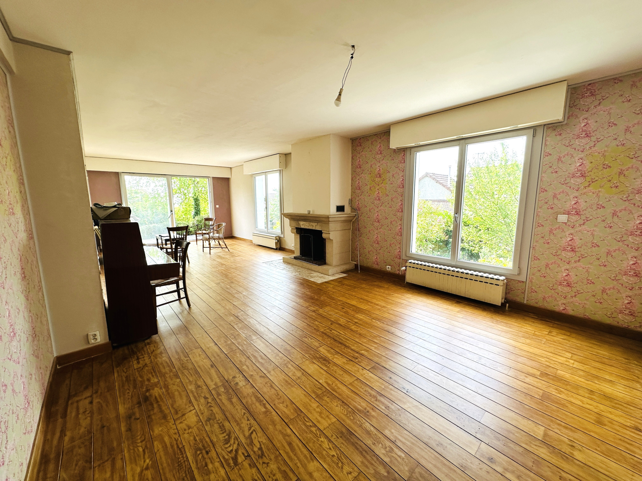 - au rez de chaussée : belle entrée lumineuse, séjour 32 m2 sol parquet avec cheminée INSERT , grande cuisine, une chambre, WC...