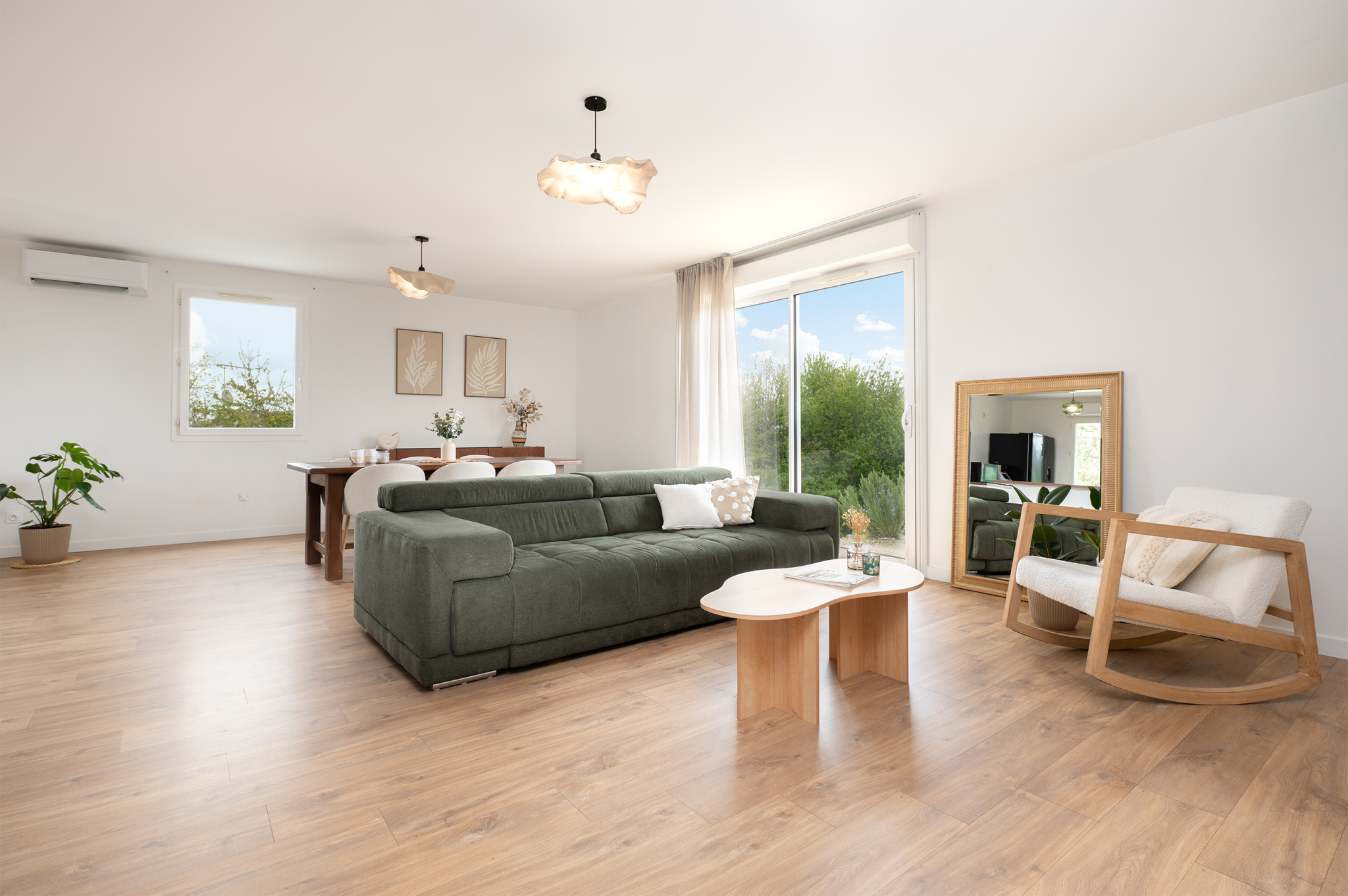 Grande pièce de vie très lumineuse avec climatisation réversible neuve (2025), finitions soignées et décoration actuelle.