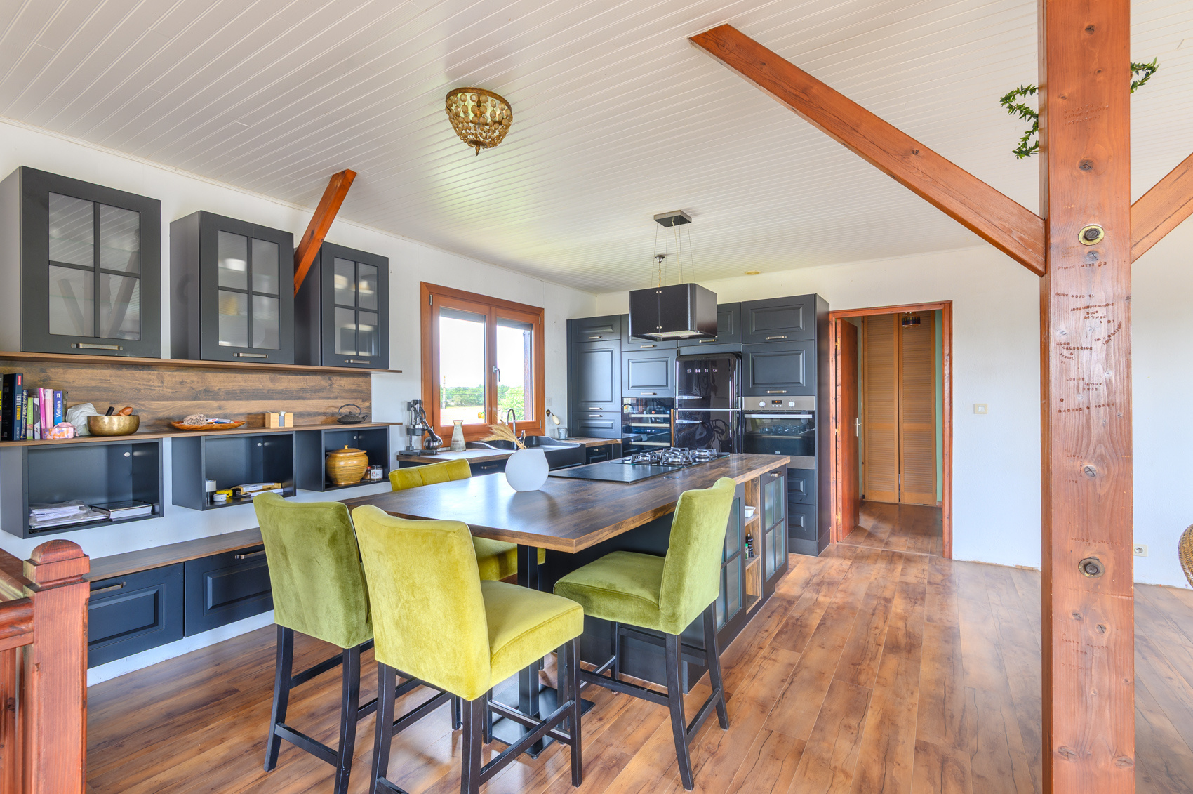 RDC : entrée avec placard, grande pièce de vie lumineuse avec cuisine aménagée et équipée (hotte, plaque, four, micro-ondes, lave-vaisselle, ...