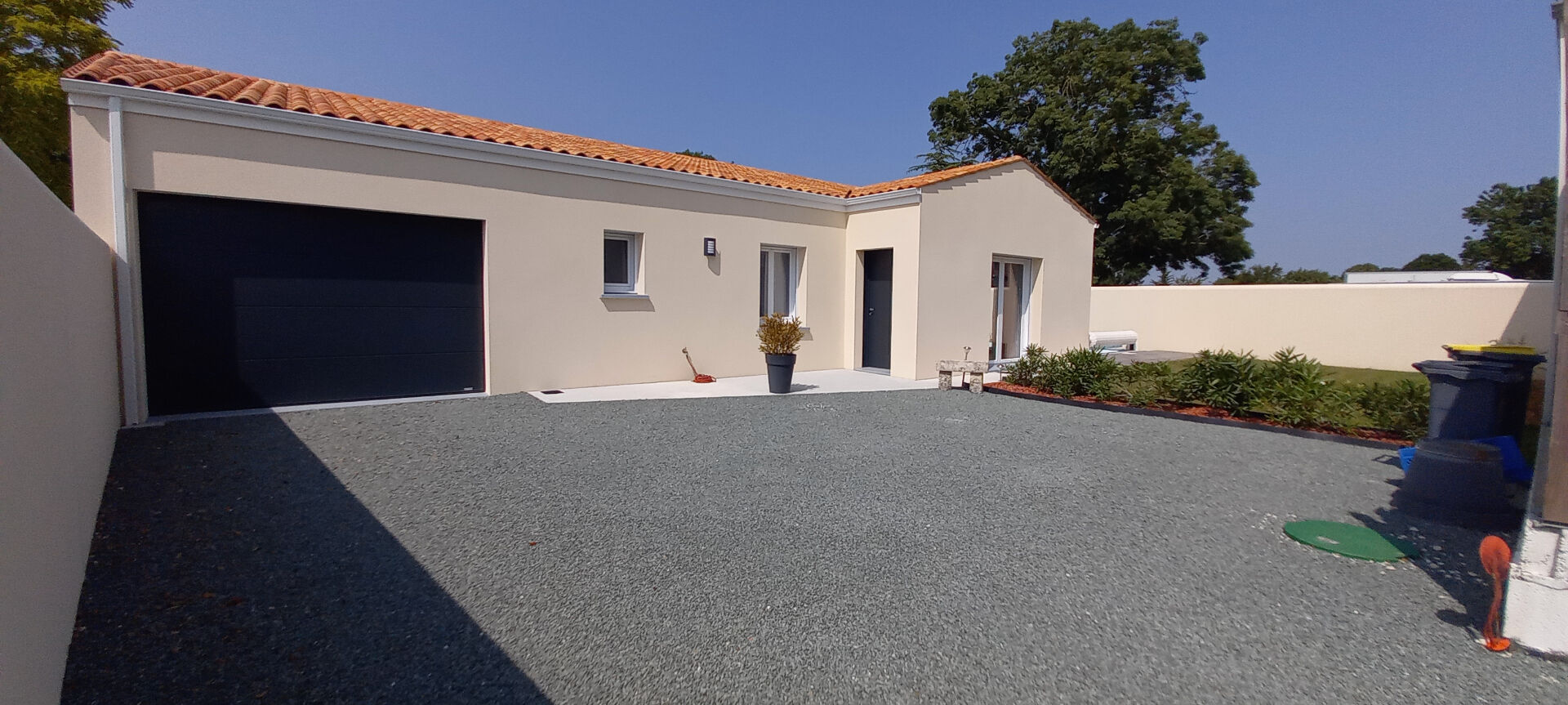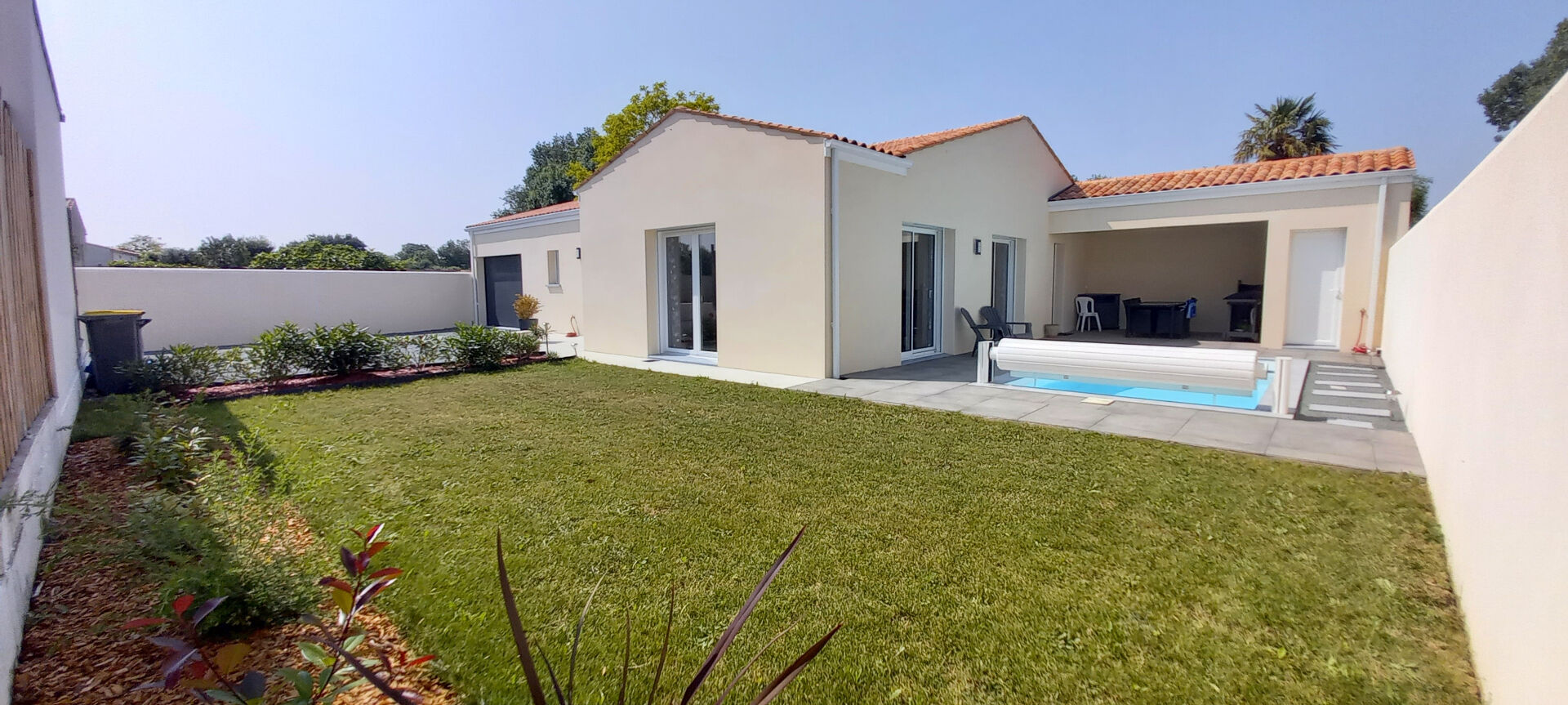 Sur une parcelle arborée d'environ 750m², plain pied composé de trois chambres, vaste séjour salon, cuisine aménagée et équipée.