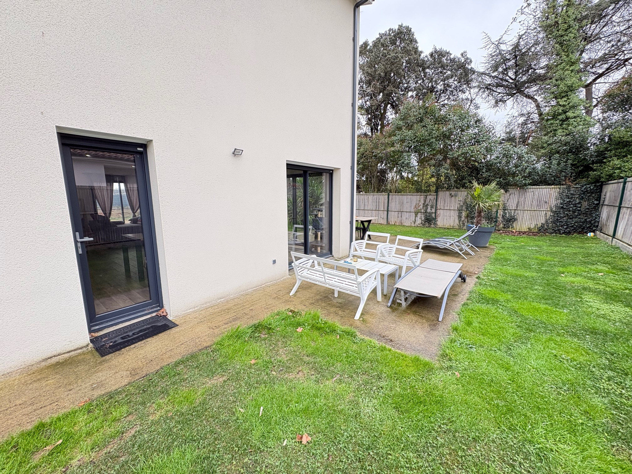Une entrée spacieuse donnant sur un double séjour avec sa baie vitrée sur le jardin, une cuisine aménagée et équipée ouverte sur le séjour ainsi q...