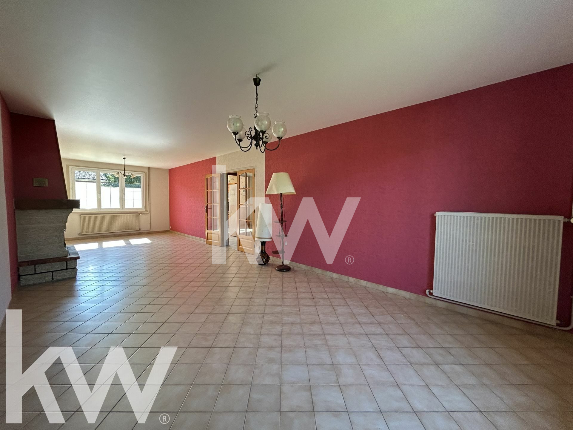 Au rez-de-chaussée : une pièce de vie lumineuse de 38 m² avec cheminée à foyer fermé, une cuisine am...