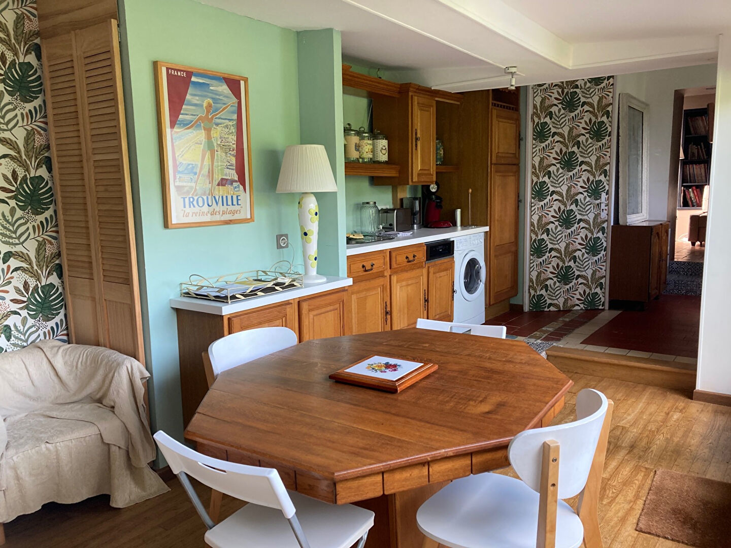 TROUVILLE . QUARTIER D'HENNEQUEVILLE. Maison de caractère atypique mitoyenne d'un côté avec terrasse en bois comprenant : salle à manger, cuisine aménagée et équipée, une petite chambre, une salle de douche avec toilettes et un salon en rdc. A l'...