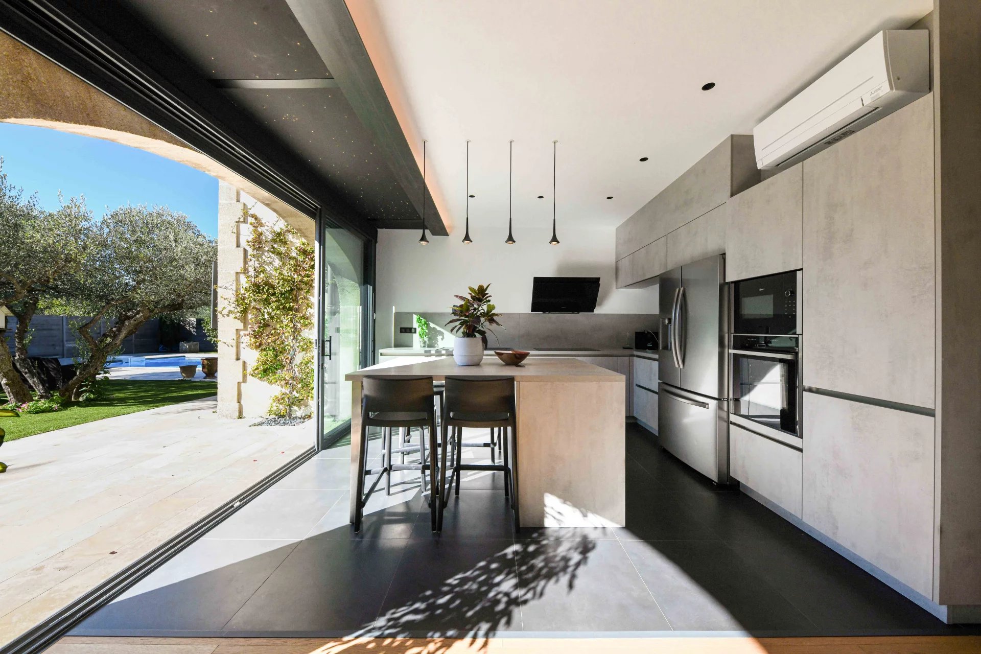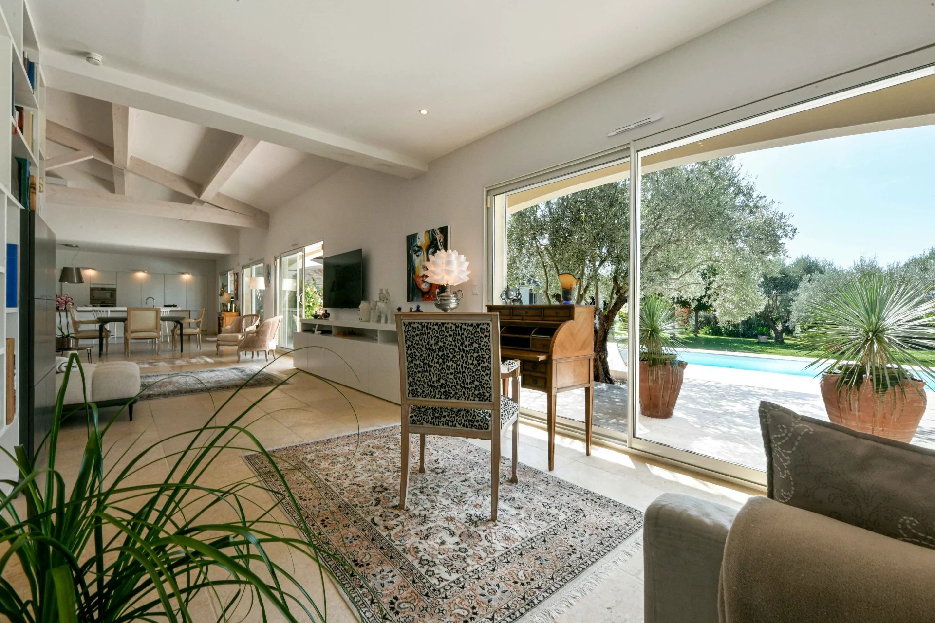 Ensemble de réception de 100 m² ouvert sur le jardin et la terrasse piscine