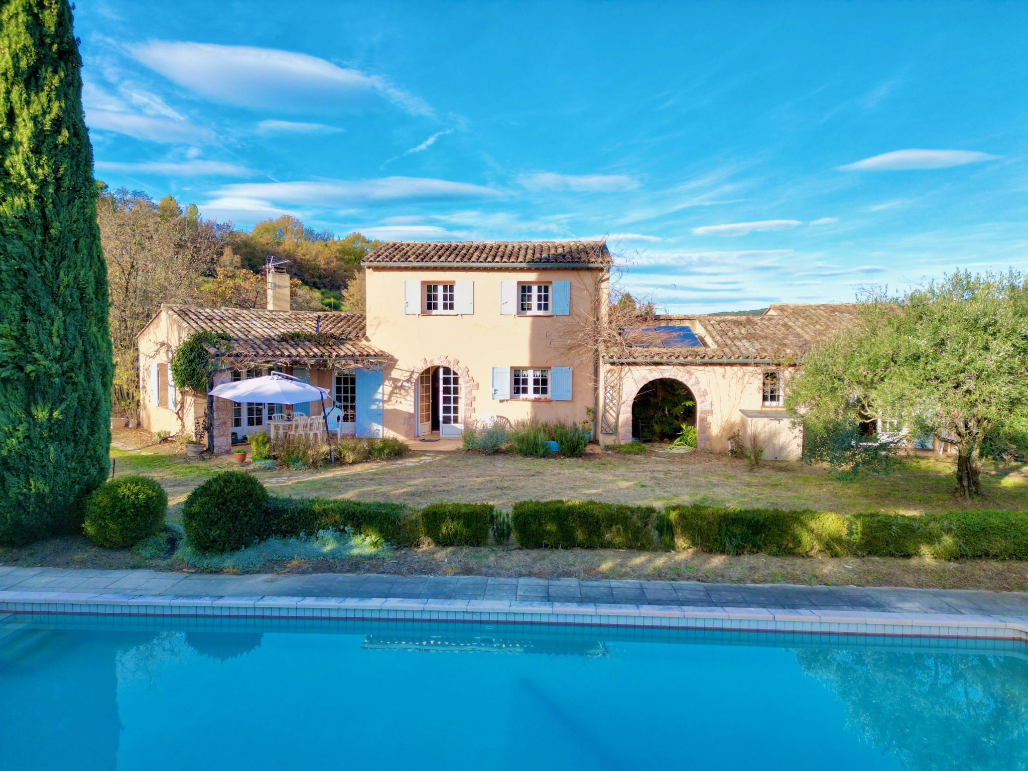 Nichée au cœur de la campagne, cette élégante villa offre un cadre de vie paisible et verdoyant avec une vue imprenable sur les collines environnantes.