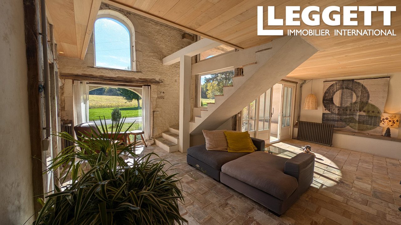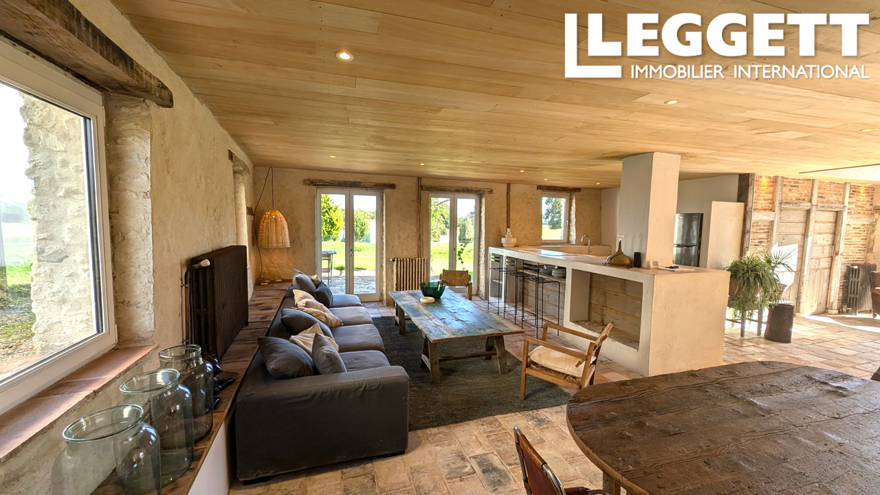 A29762ELM17 - A 15mn de la ville thermale de Jonzac et 1h de Bordeaux, cette propriété a été entièrement rénovée avec goût offrant un espace de vie ouvert et fluide sur 172m². Les poutres apparentes, les tomettes "feuillets" et les murs en moellons p...