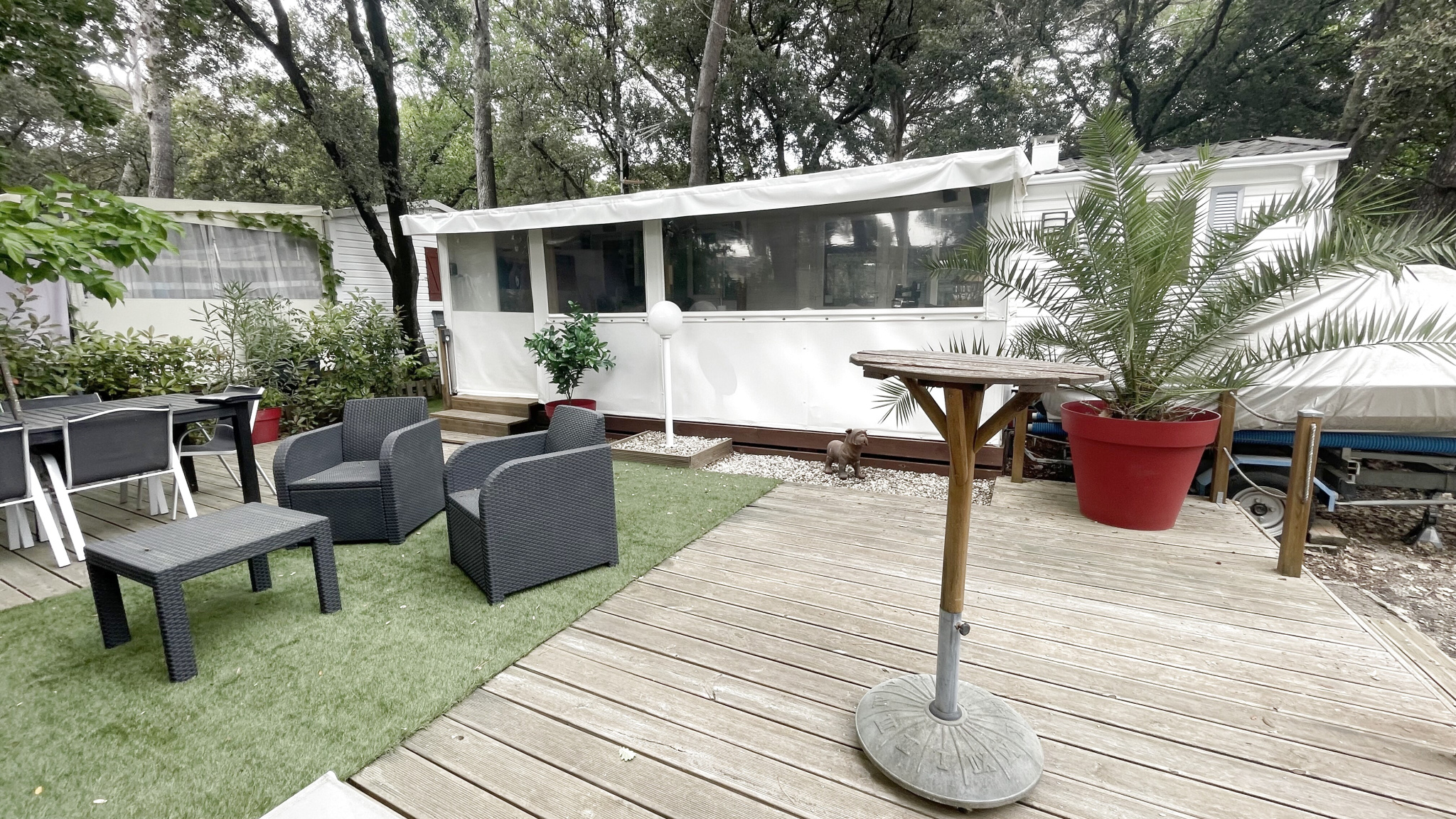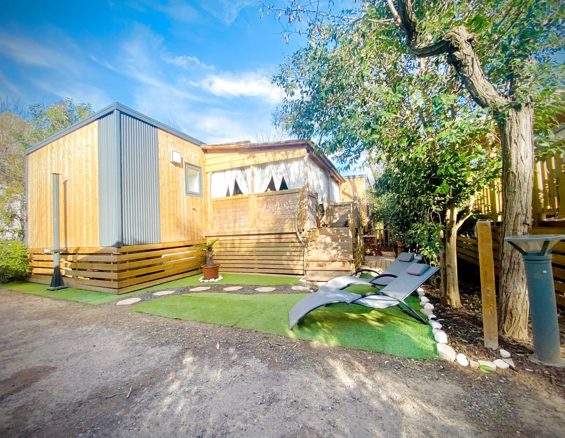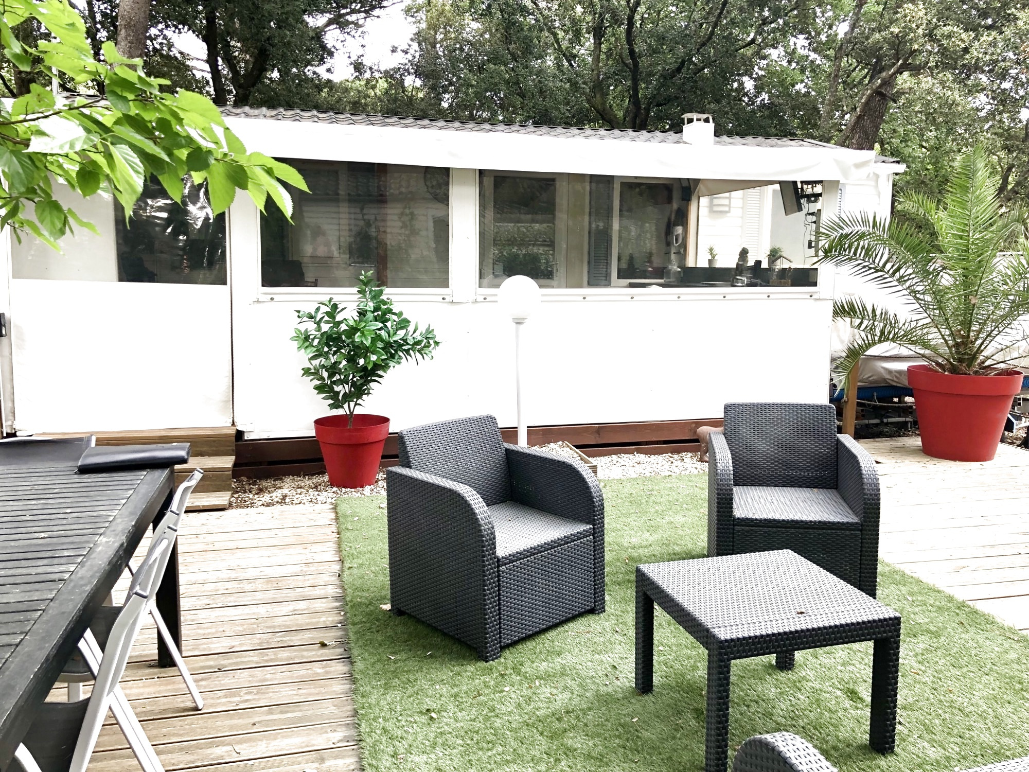 83370 Fréjus. Magnifique mobilhome récent avec bardage bois situé dans un village vacances écologique au sein d'une oasis de verdure avec son port privé sur la rivière l'Argens, son service de navette fluviale pour un accès direct aux plages, ses 3 p...