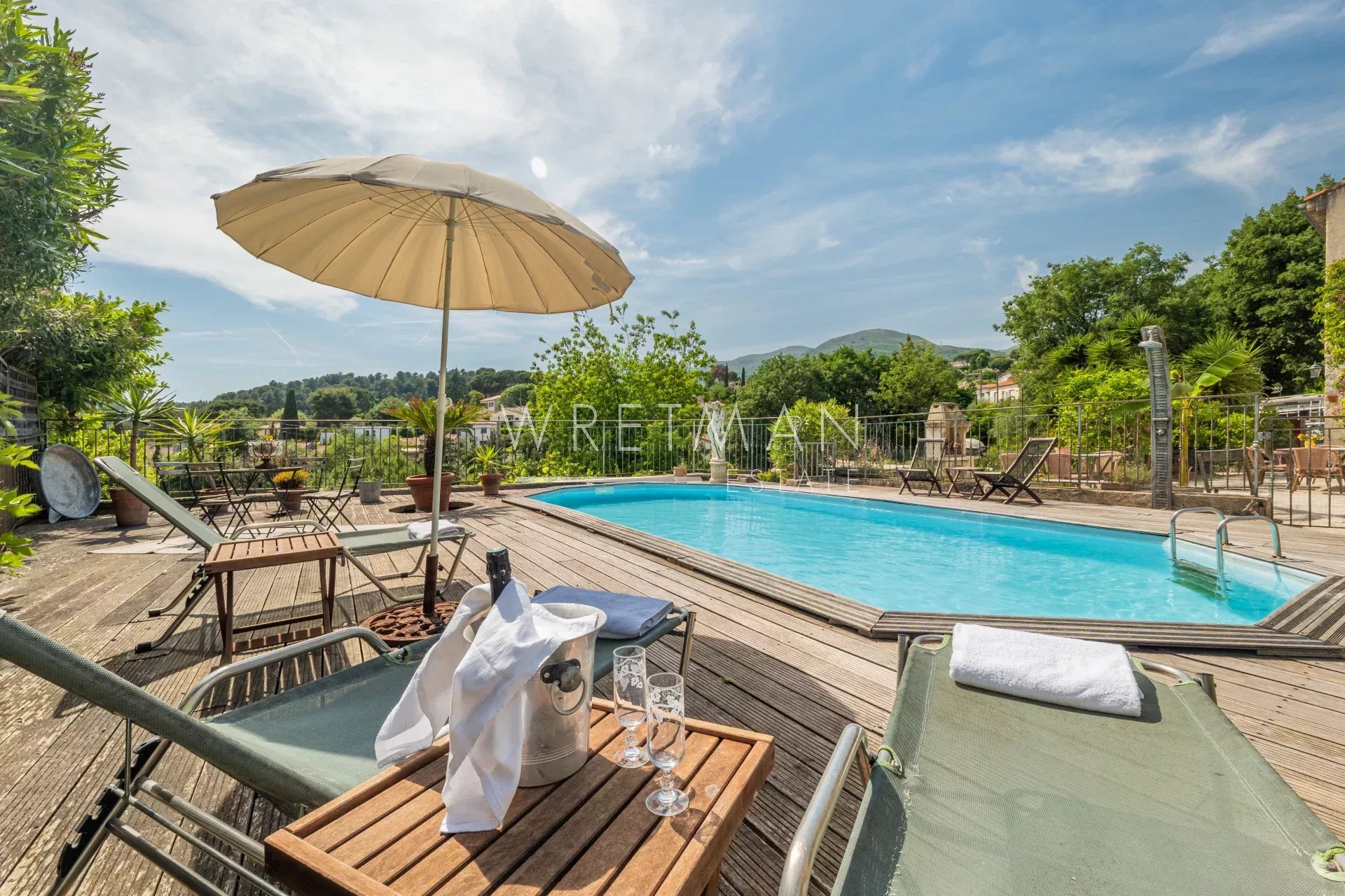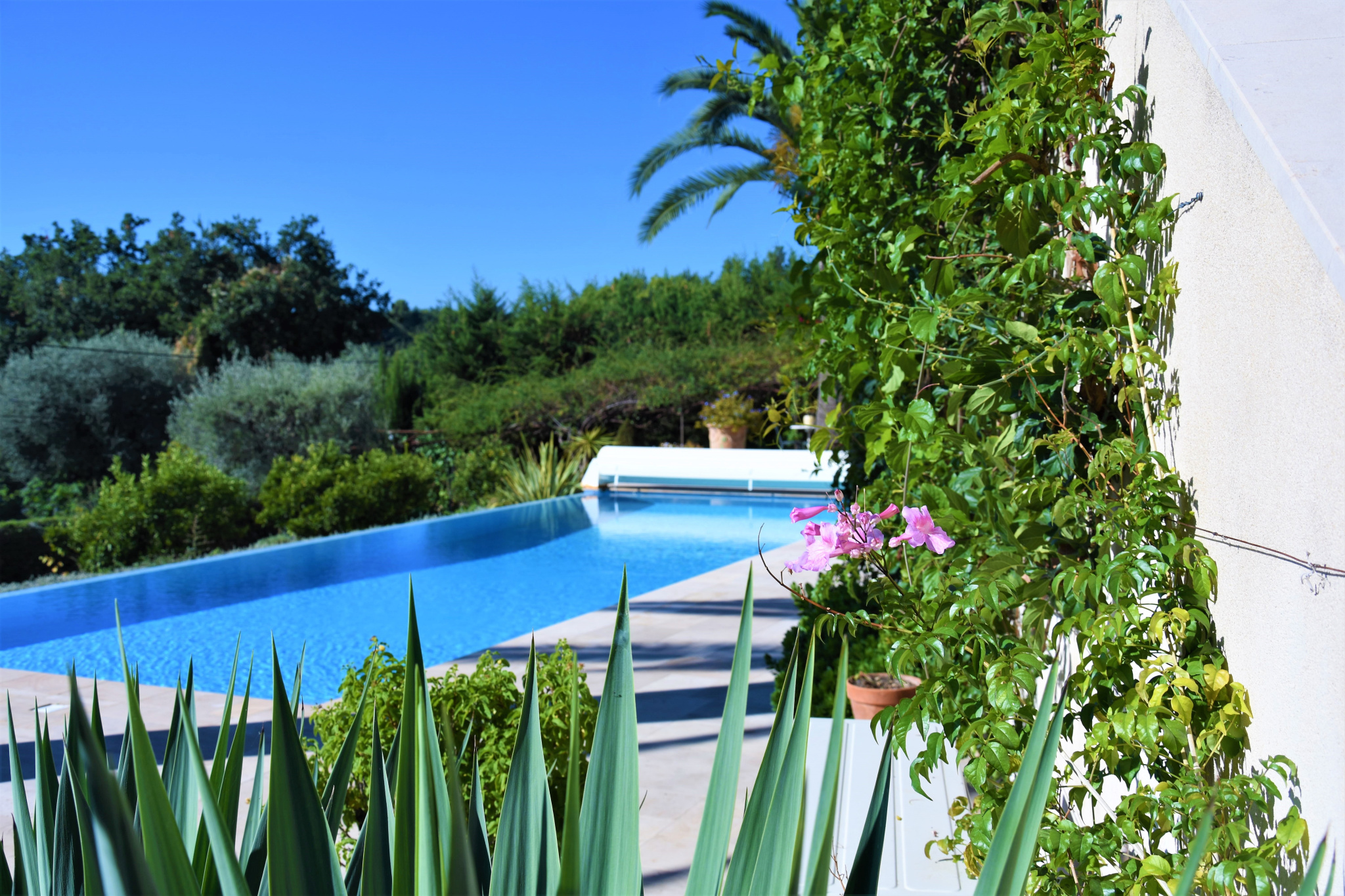 Propriété sans vis-à-vis, avec piscine et grand jardin plat, à 7 minutes du centre de Vence. Belle vue dégagée sur les montagnes et au calme absolu.