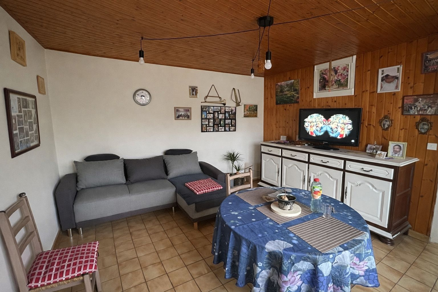 2 chambres, une grande pièce de vie, cuisine, salle d'eau, wc, terrasse en bois couverte et un abri de jardin.