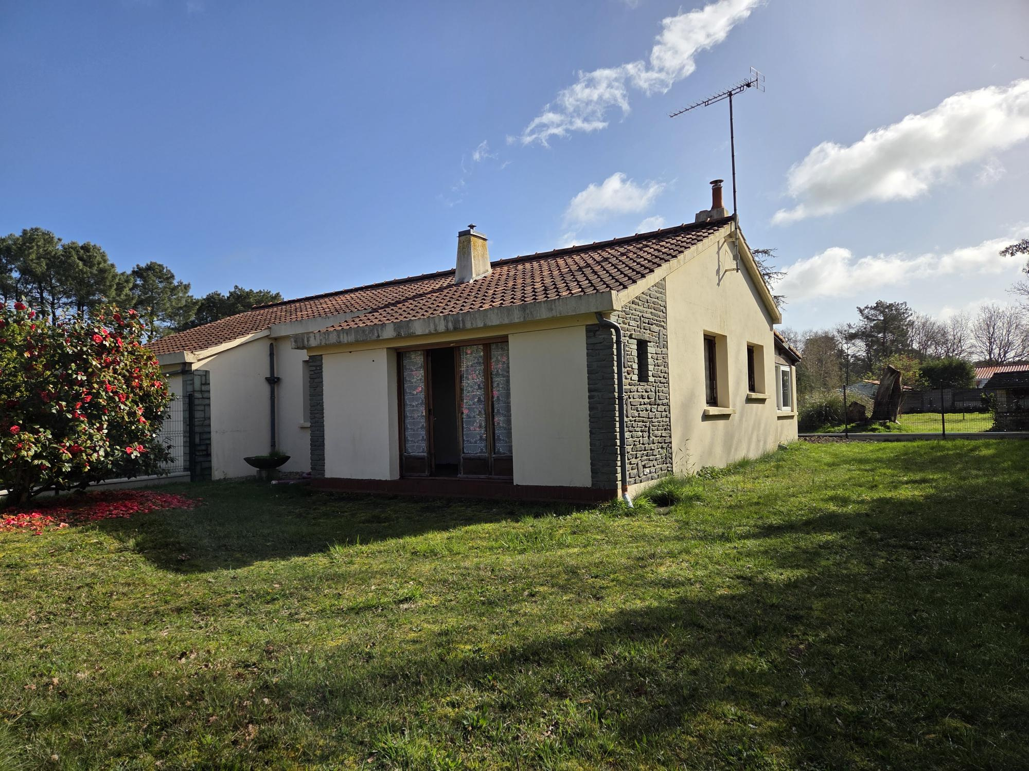 10 minutes des plages, ou de Challans, quartier paisible et boisé pour cette maison bâtie sur environ 700 m2, 72 m2 habitables à rénover, + viabilisée en eau et assainissement.