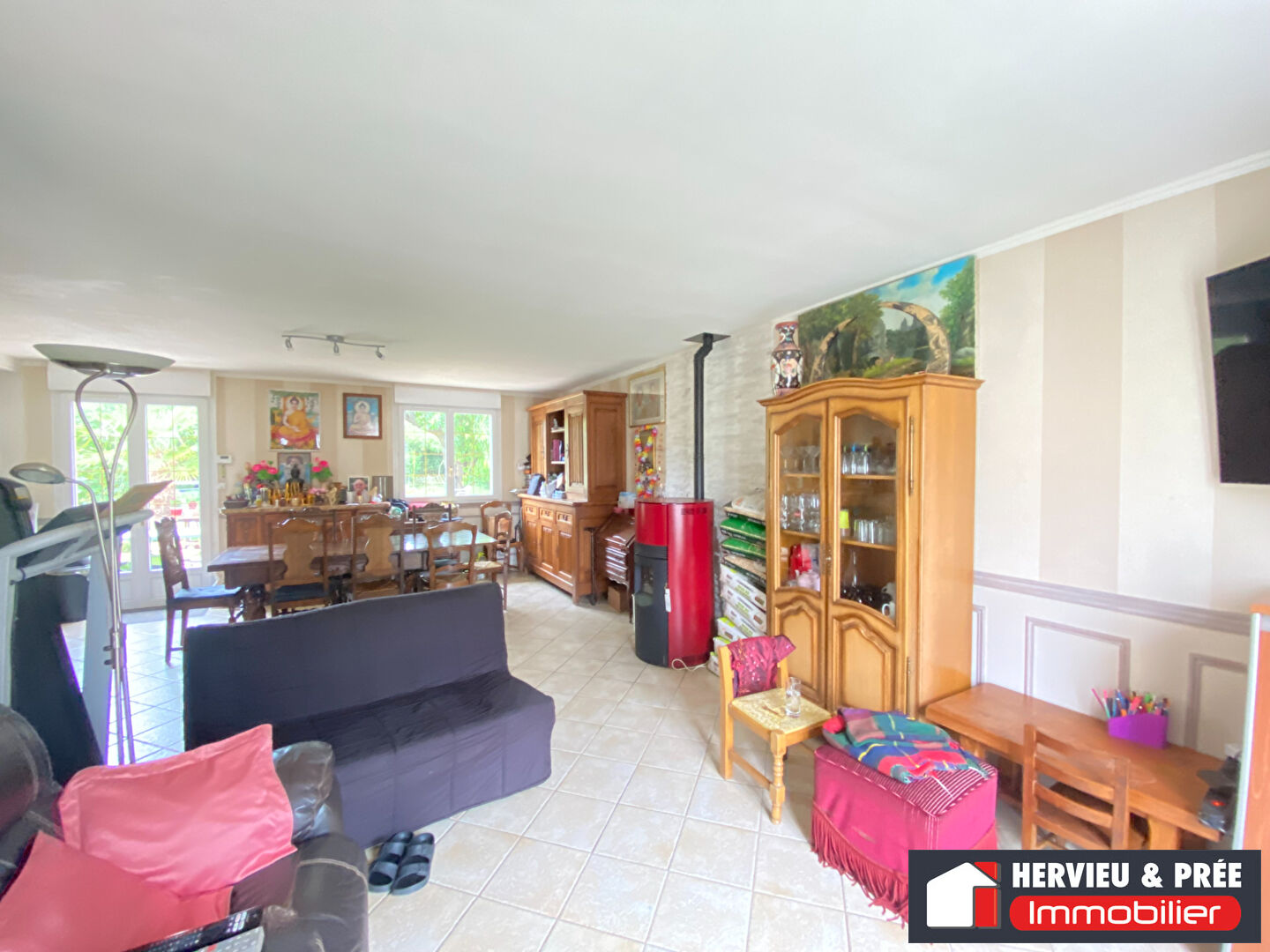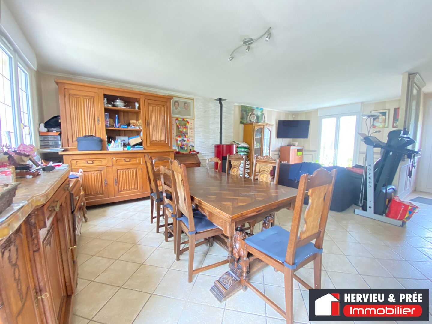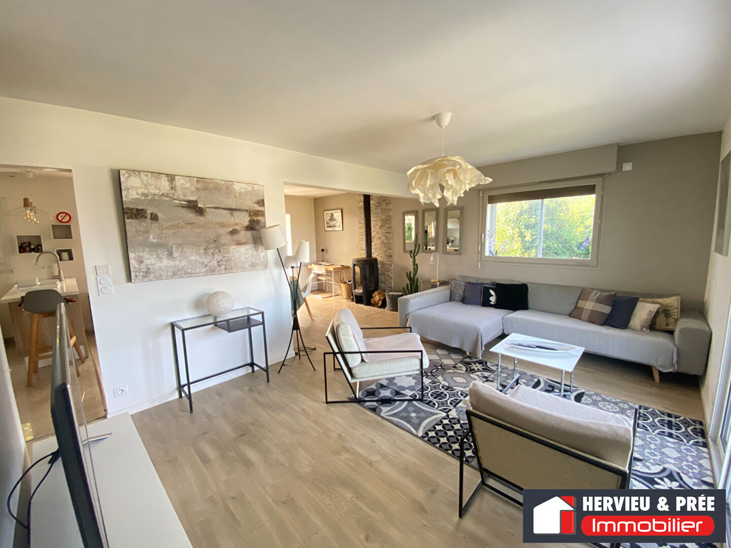 Entrée, cuisine aménagée, séjour double avec cheminée insert à pellets.