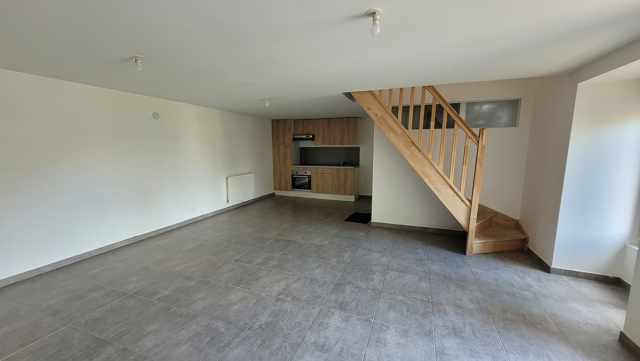 Au rez-de-chaussée, une pièce de vie baignée de lumière avec cuisine aménagée et équipée.
