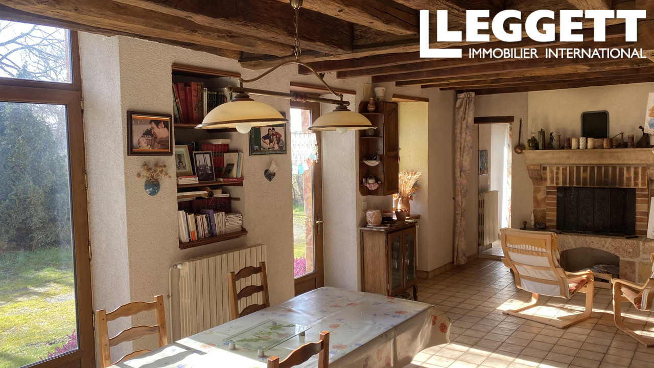 La maison dispose d'un magnifique grand salon/salle à manger au centre de la pièce à vivre, avec poêle à bois et poutres apparentes.