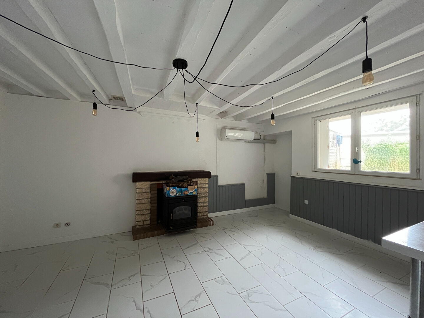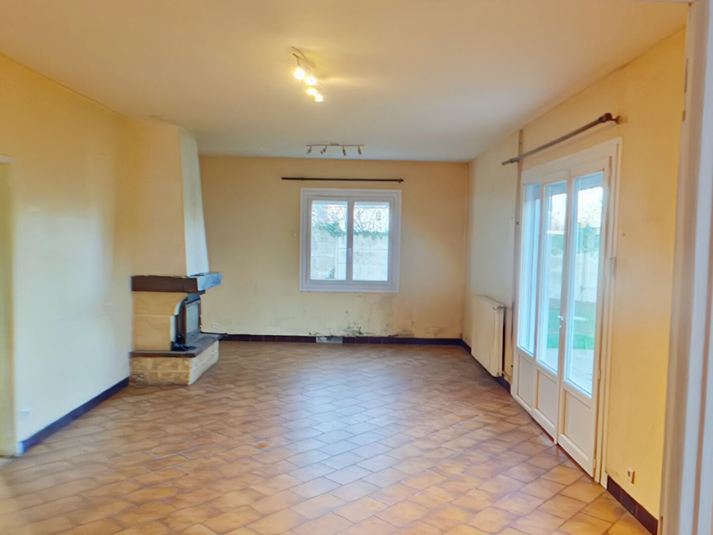 une entrée, un salon lumineux équipé d'un insert, trois chambres,