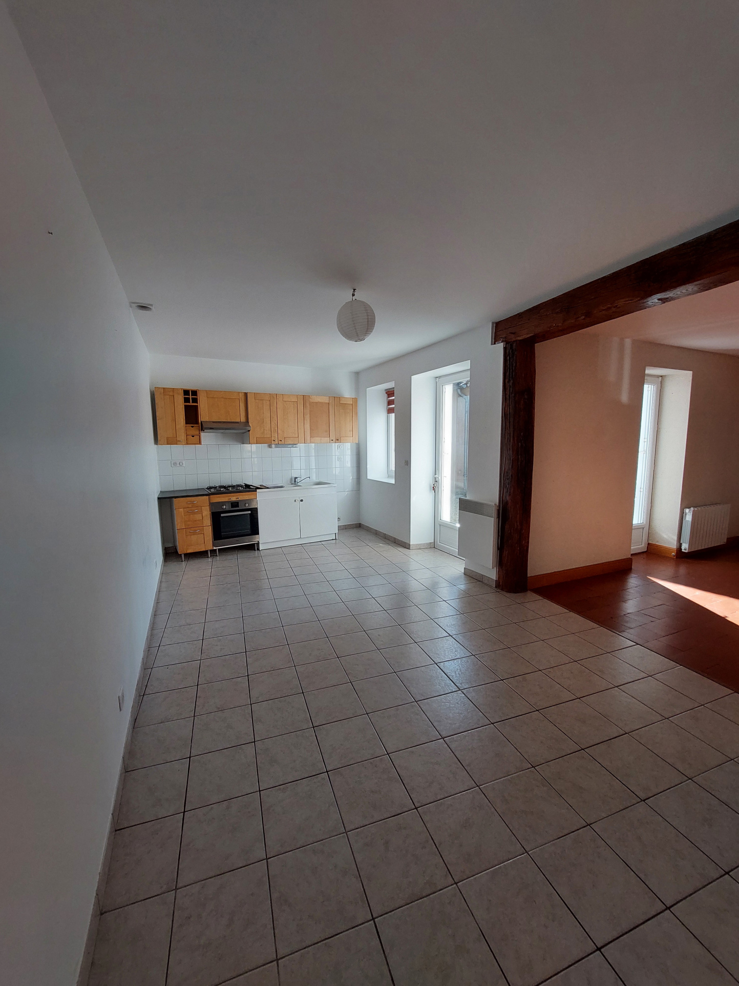 Maison de bourg comprenant : entrée sur pièce de vie avec cheminée insert, cuisine aménagée semi-équipée, WC avec lave-mains et cellier avec chauffe eau.