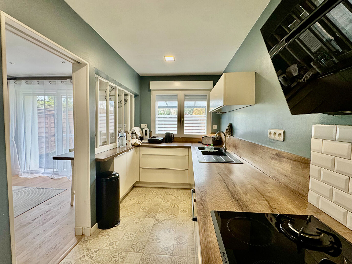 Entrée avec carrelages anciens, séjour CFDB, cuisine et salle-de-bain.