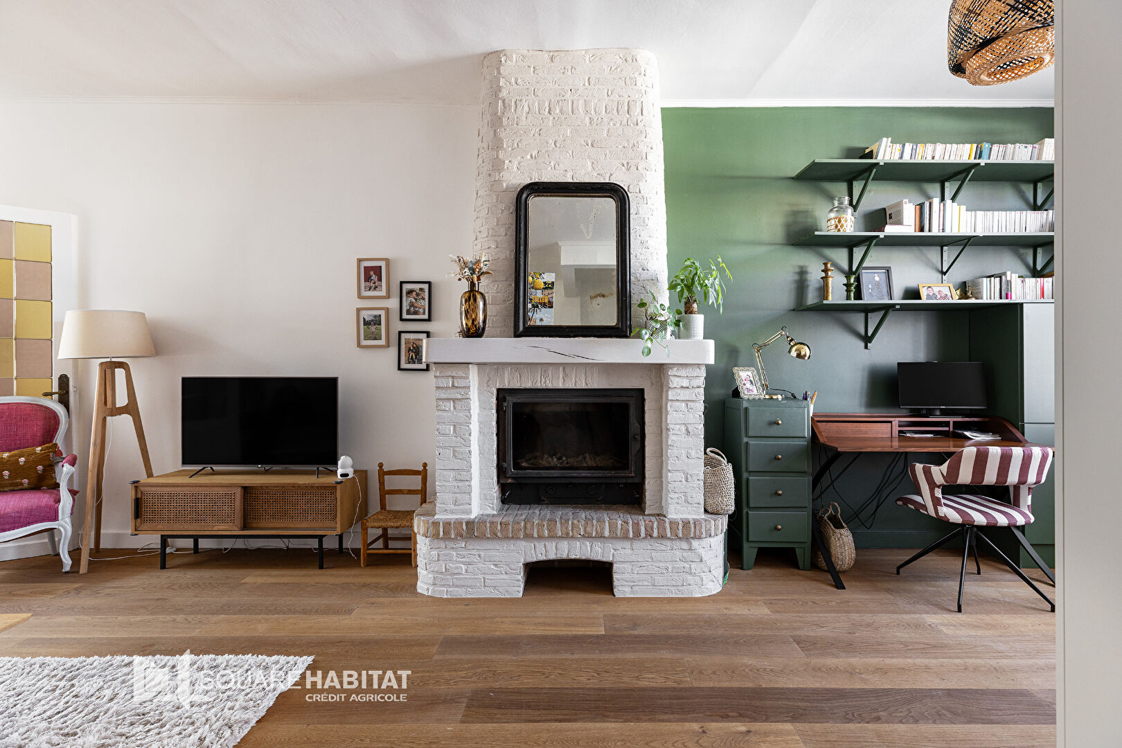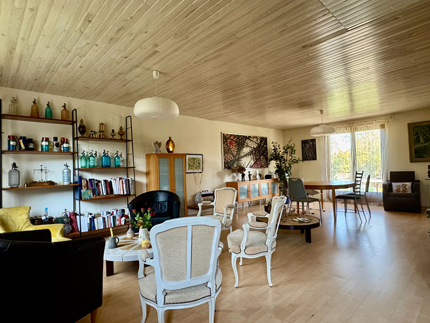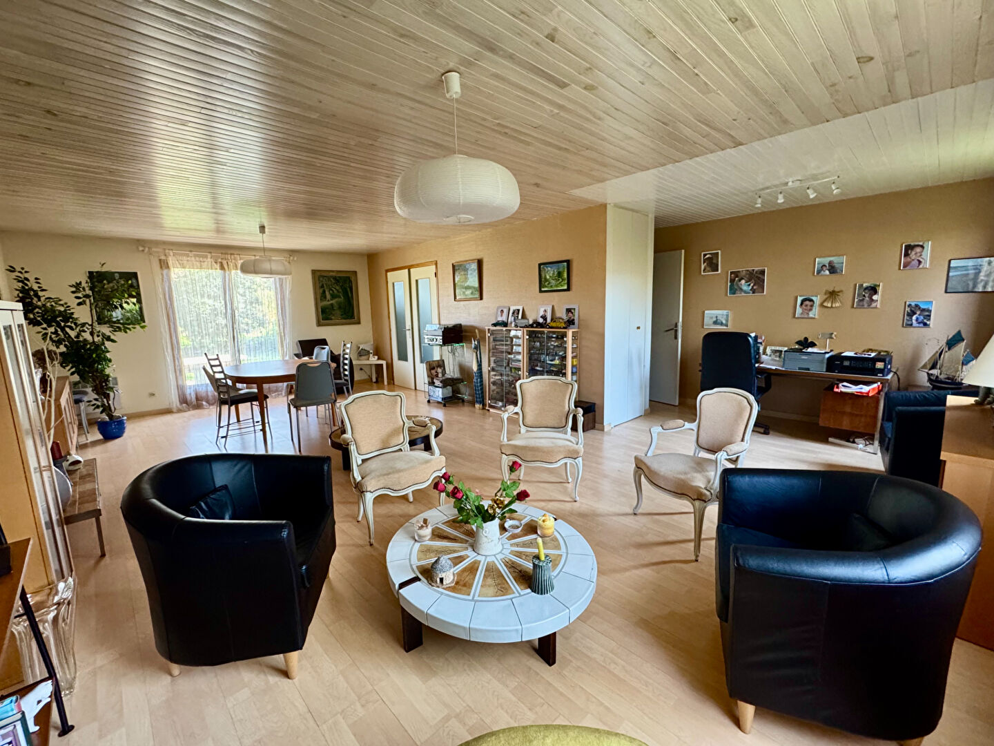Belle pièce de vie lumineuse et traversante avec cheminée ouverte sur le jardin. La cuisine attenante, offre é...