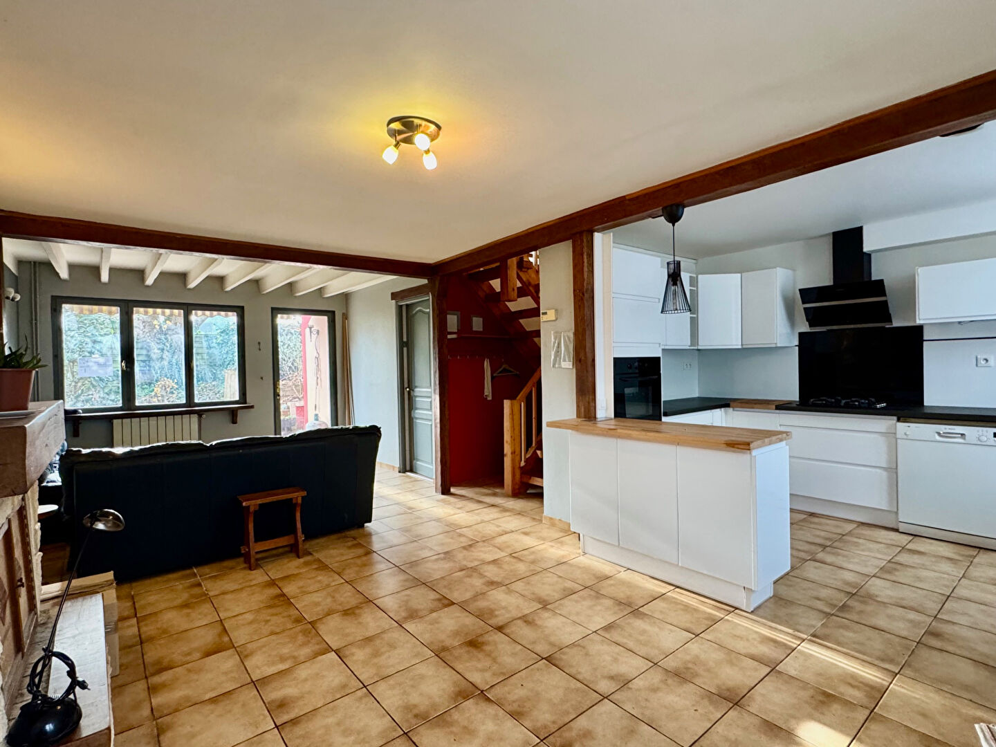 Bel espace de vie, grande cuisine équipée donnant sur le jardin et salle de bains en rez-de-chaussée.