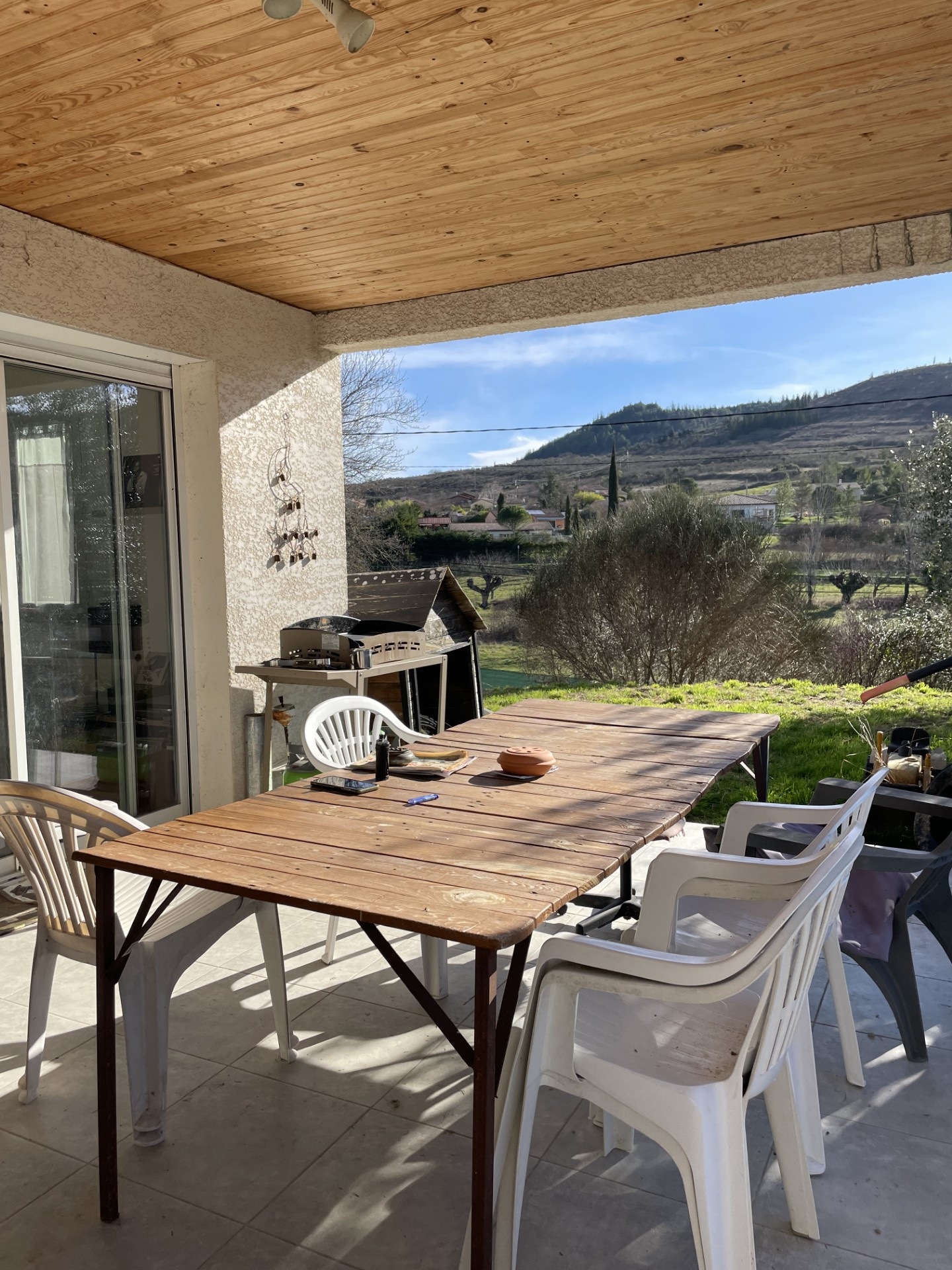 A vendre, Sud Ardèche, Villeneuve de Berg, jolie maison de plain-pied d'environ 98 m2 habitables comprenant : une cuisine ouverte sur séjour, 3 chambres, une salle d'eau, un wc, une terrasse, une véranda. Un abri jardin, une piscine 6m x3.5m et son l...