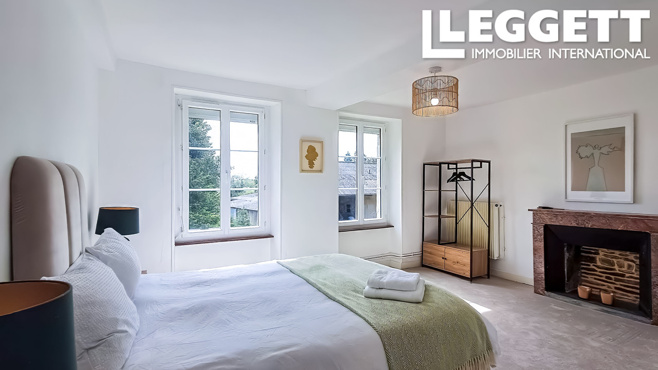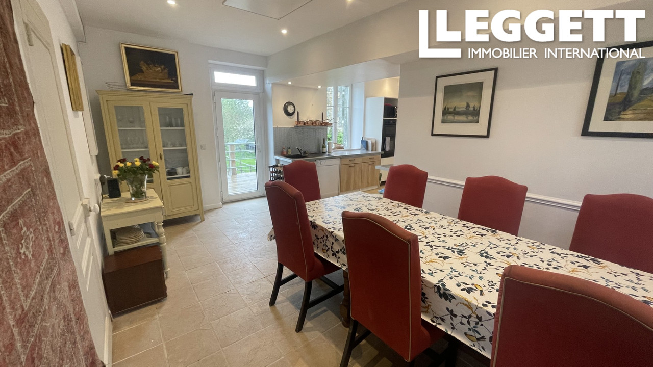 Maison rénovée sur 2 niveaux comprenant : entrée, arrière-cuisine, buanderie, cuisine aménagée équipée avec cheminée, séjour-salon, bureau, 2 dressings, 3 sdb et 5 chambres dont une avec sdb privative.