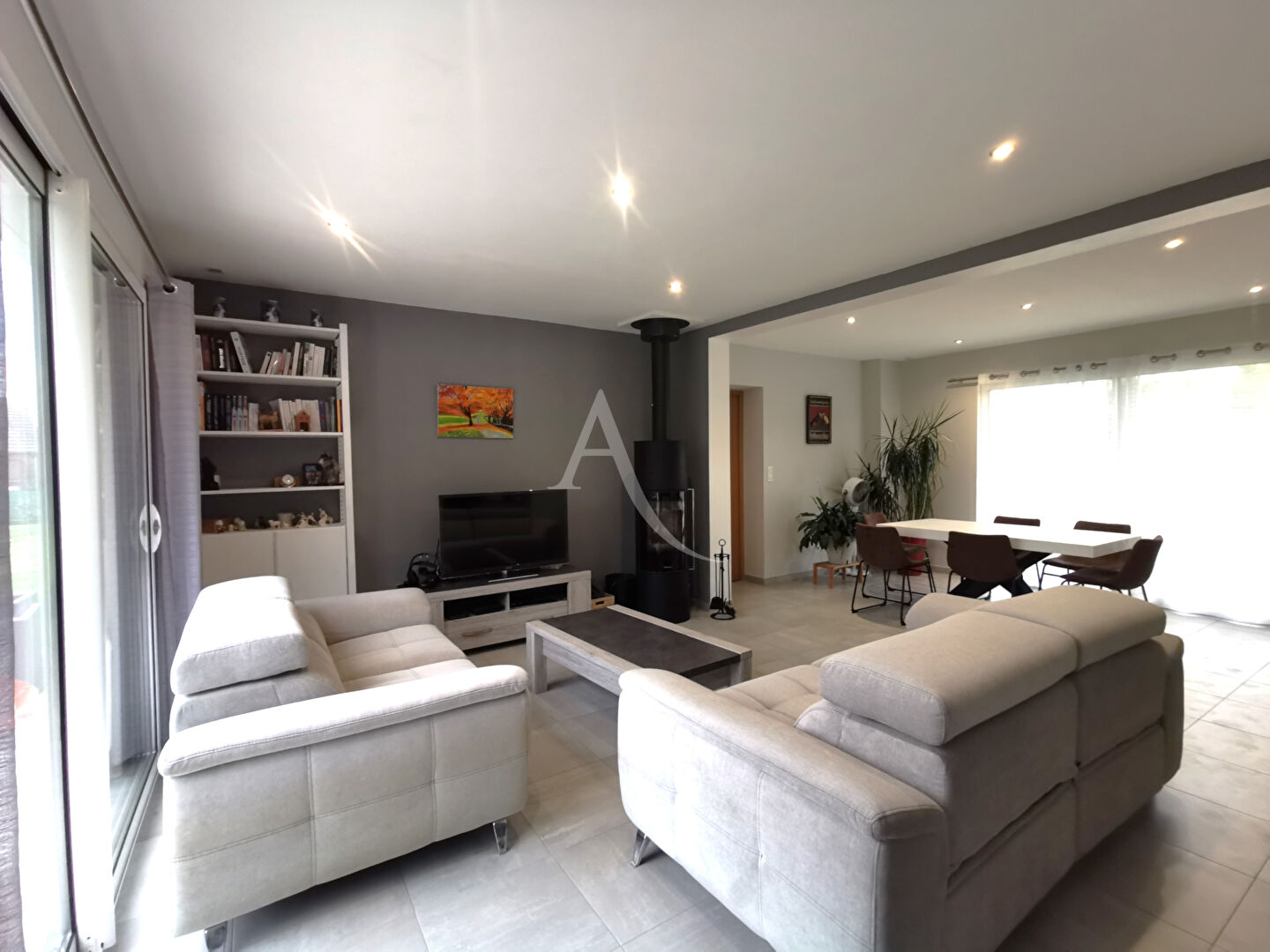 EXCLUSIVITE ! Au calme, maison de 124 m2 environ sur sous-sol total comprenant au rez-de-chaussée: entrée, grand séjour-salon avec cheminée et cuisine ouverte aménagée et équipée, couloir avec rangement, WC, salle de bains, deux chambres (dont une avec placard...