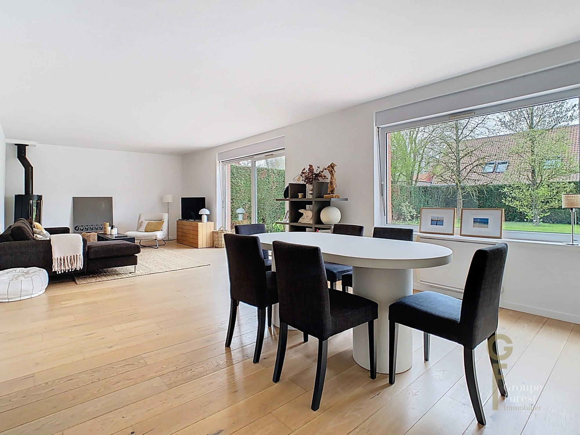 - Hall d'entrée donnant sur un grand séjour parqueté de 40 m2 avec poêle à bois, baigné de lumière