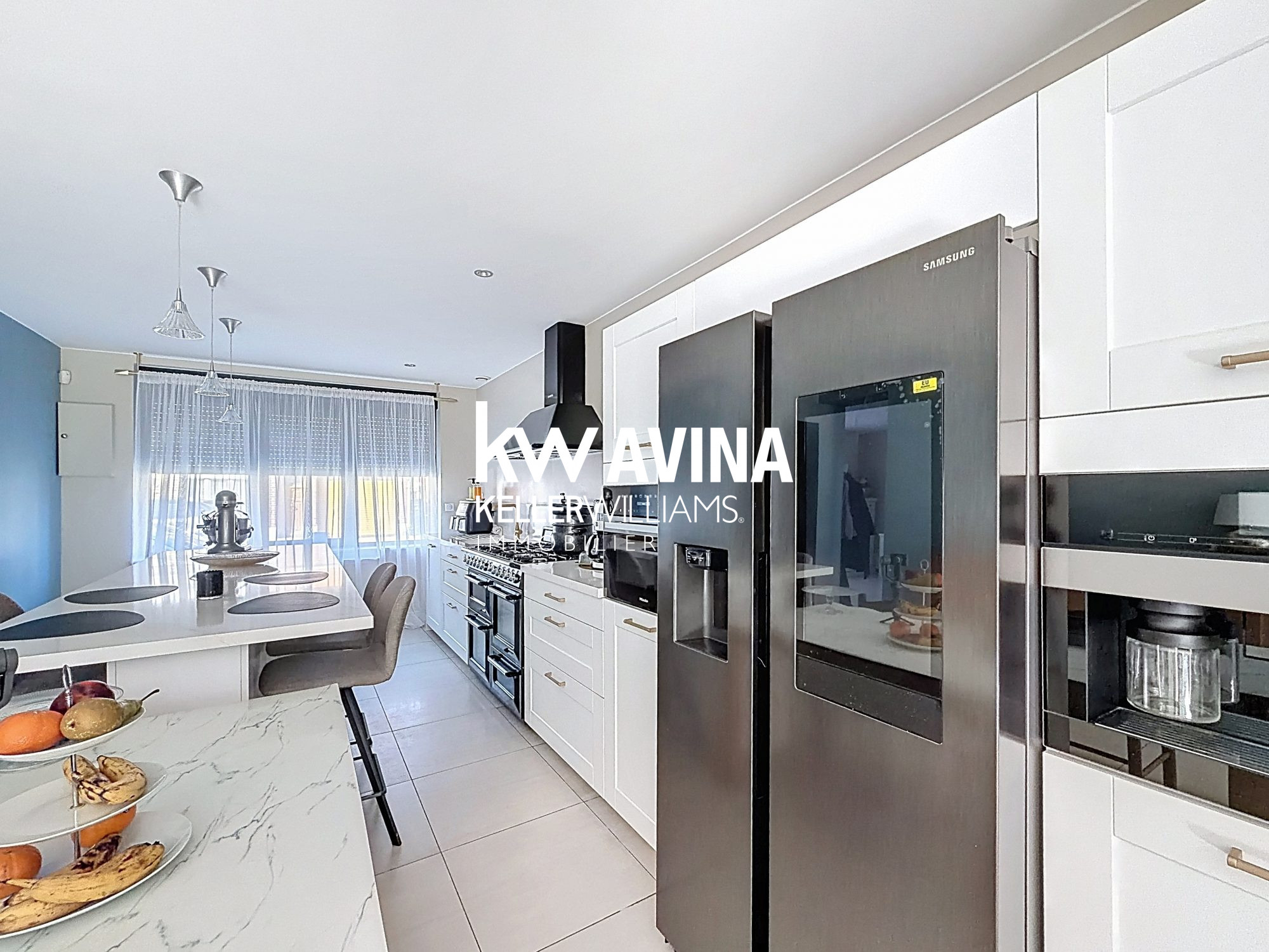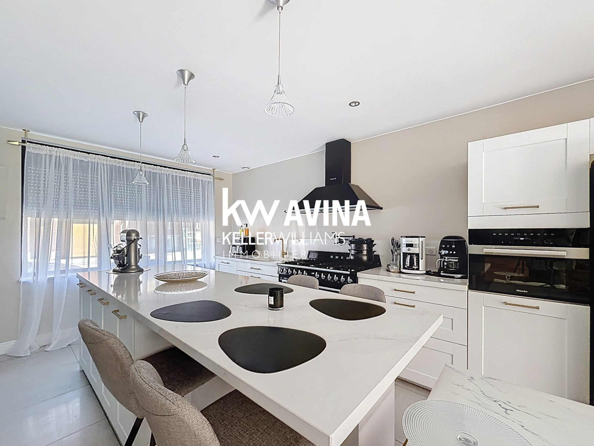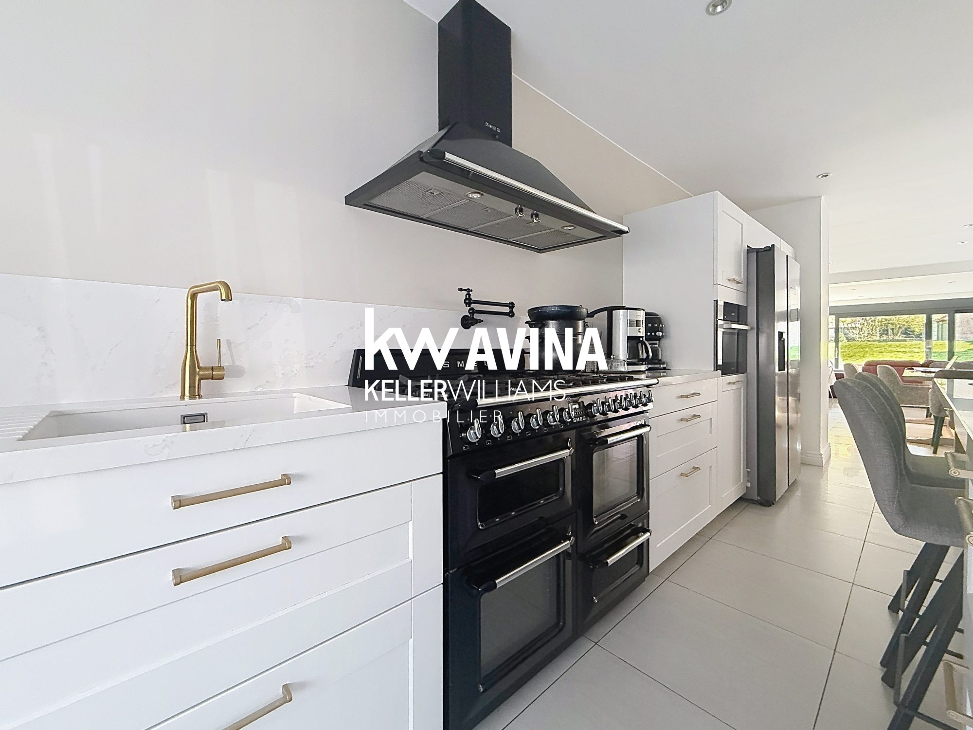 Bel espace de vie avec cuisine équipée ouverte avec son ilot central, avec portes fenêtres donnant sur le jardin.