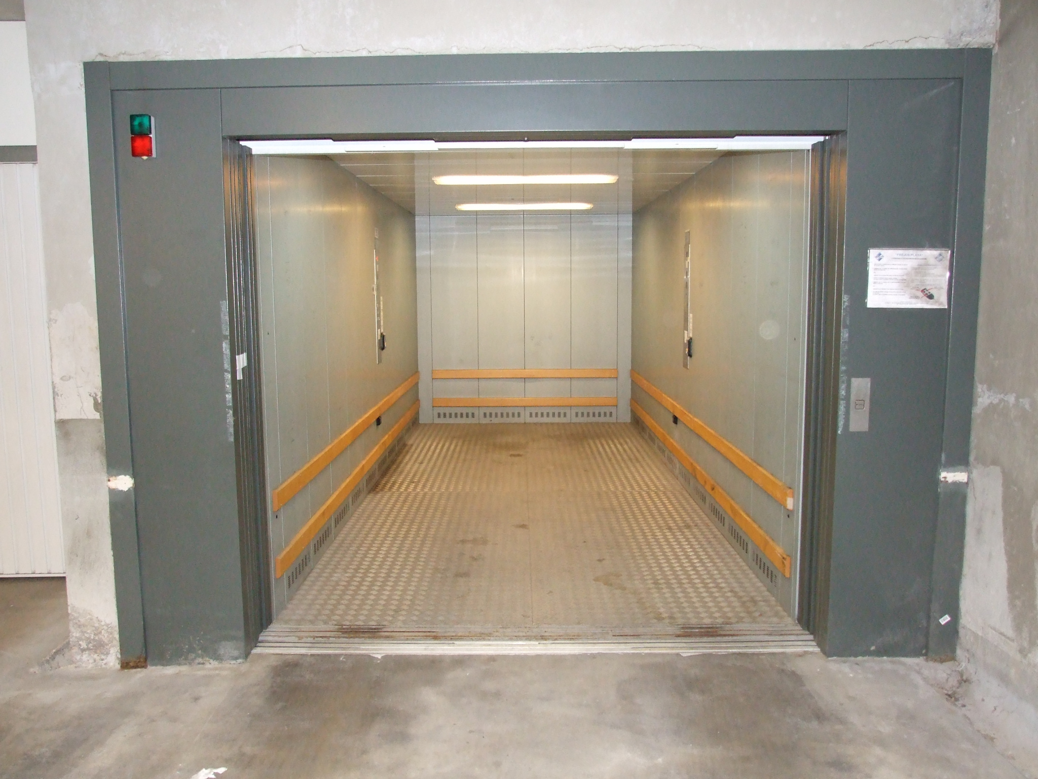 Accès par rampe béton et ouverture d'une porte de type basculante en entrée du sous-sol. Ouverture p...