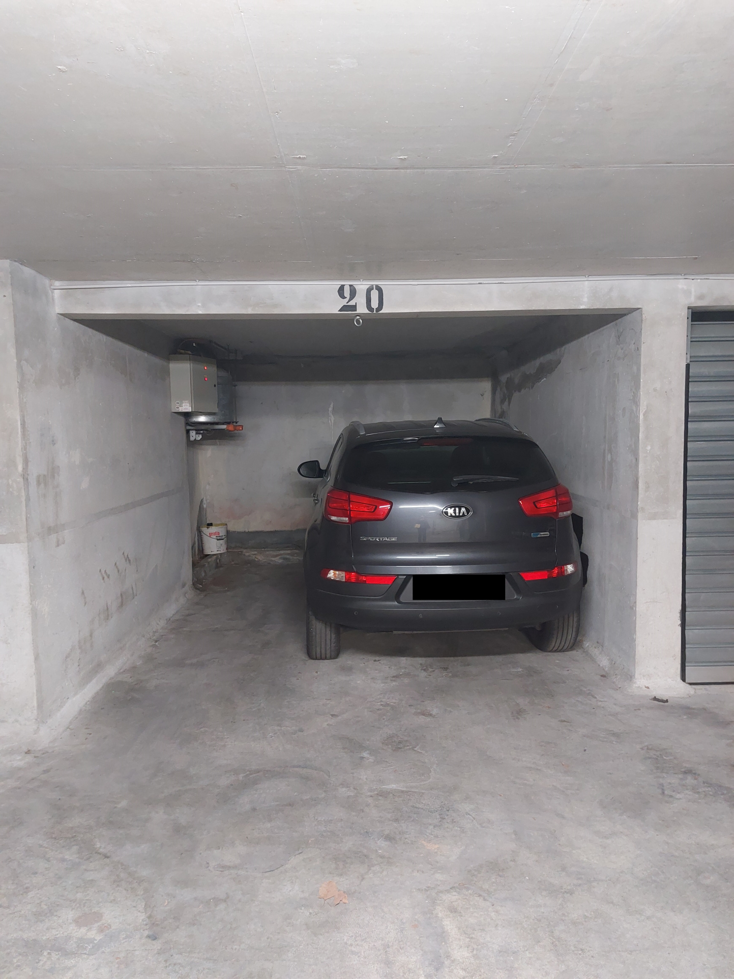 Garage fermé en sous-sol avec porte coulissante. Ouverture aisée.