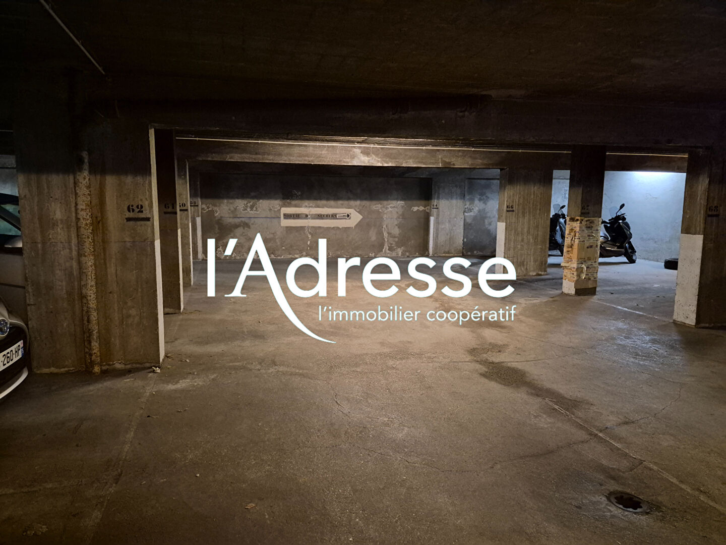 Demi-box avec fermeture par porte métallique, situé dans un immeuble sécurisé avec gardien. Il s'agit d'un emplacement au sein d'un double box.