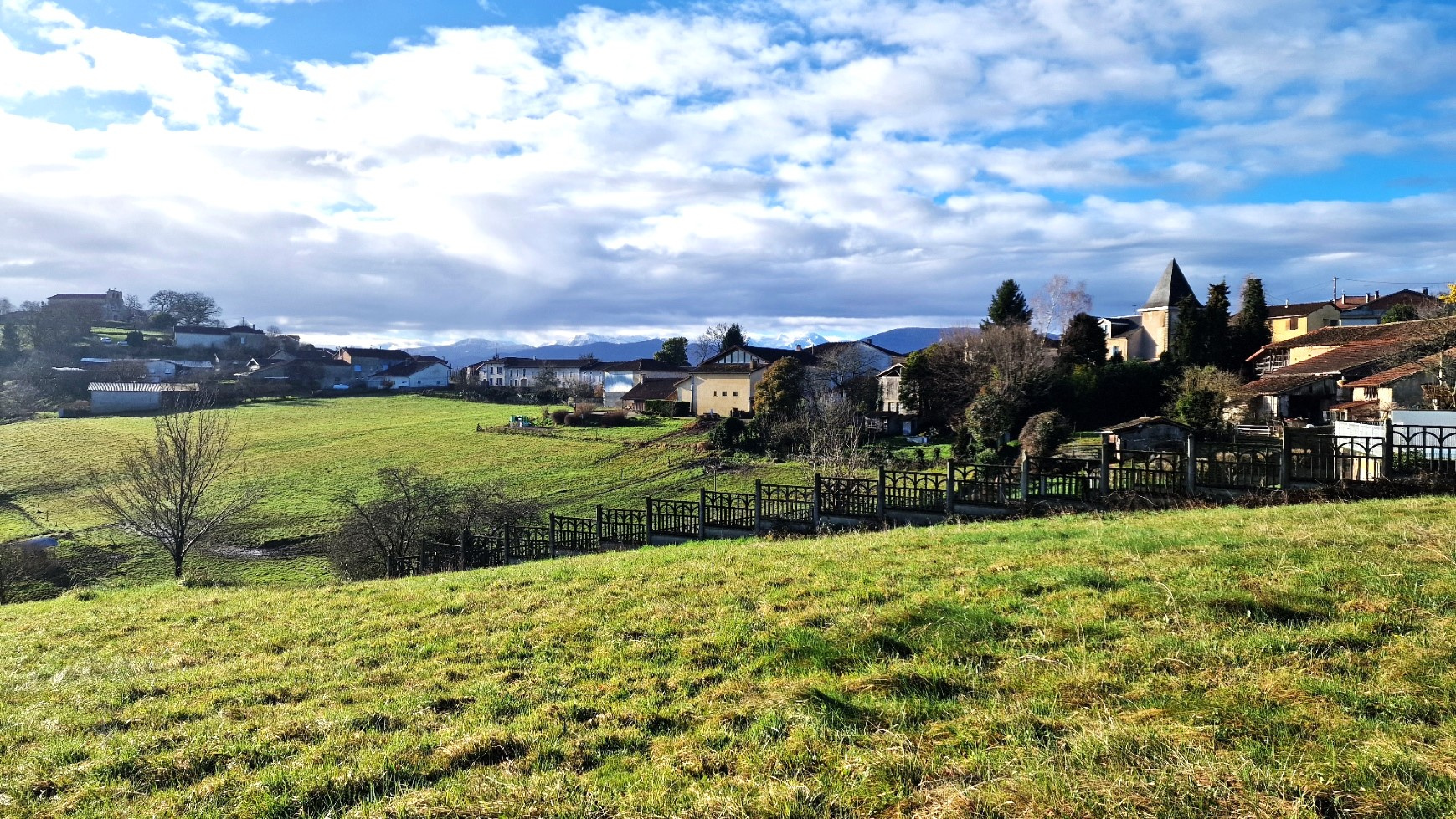Grand terrain avec une très jolie vue dégagée sur le village et les Pyrénées majestueuses.