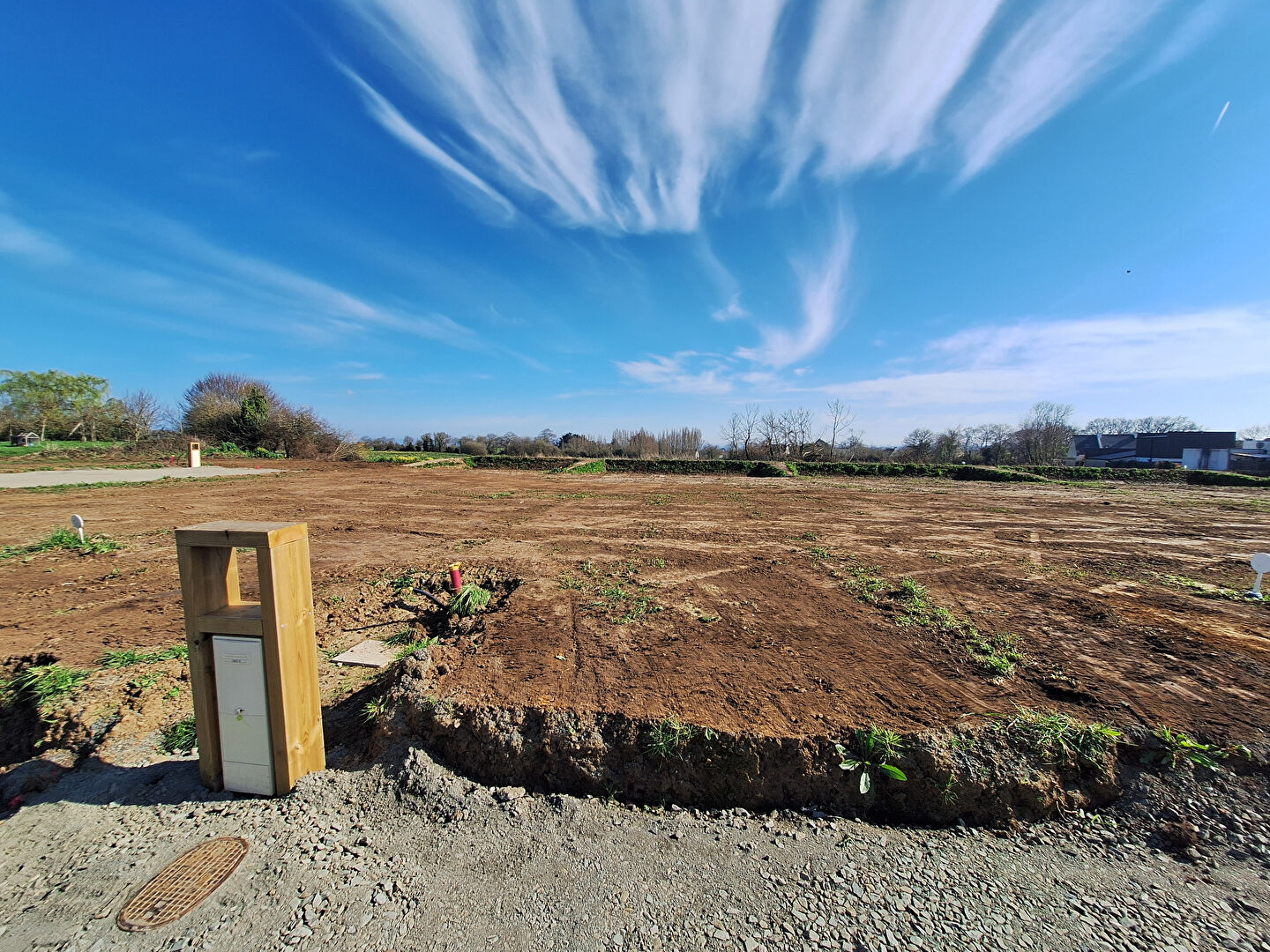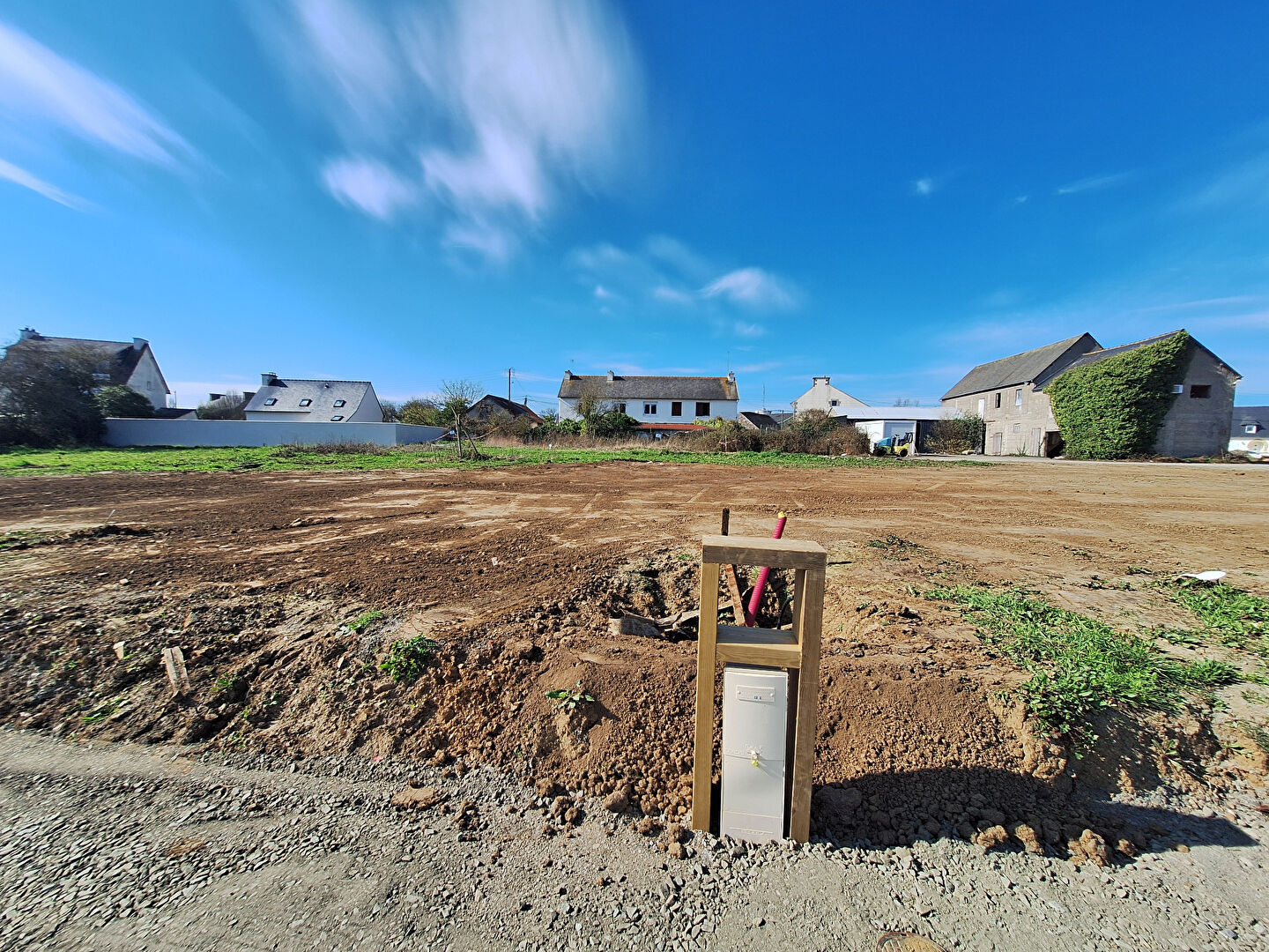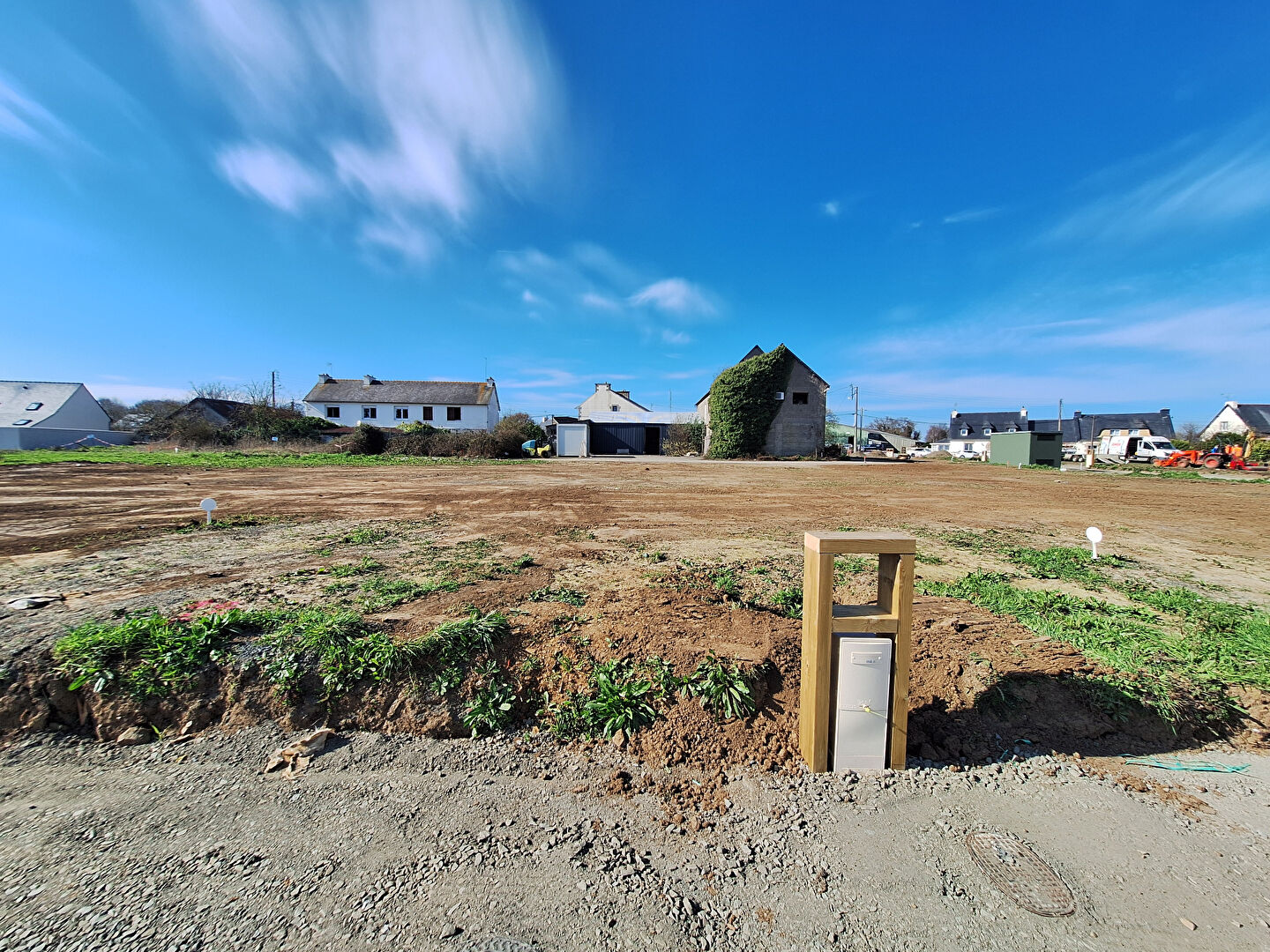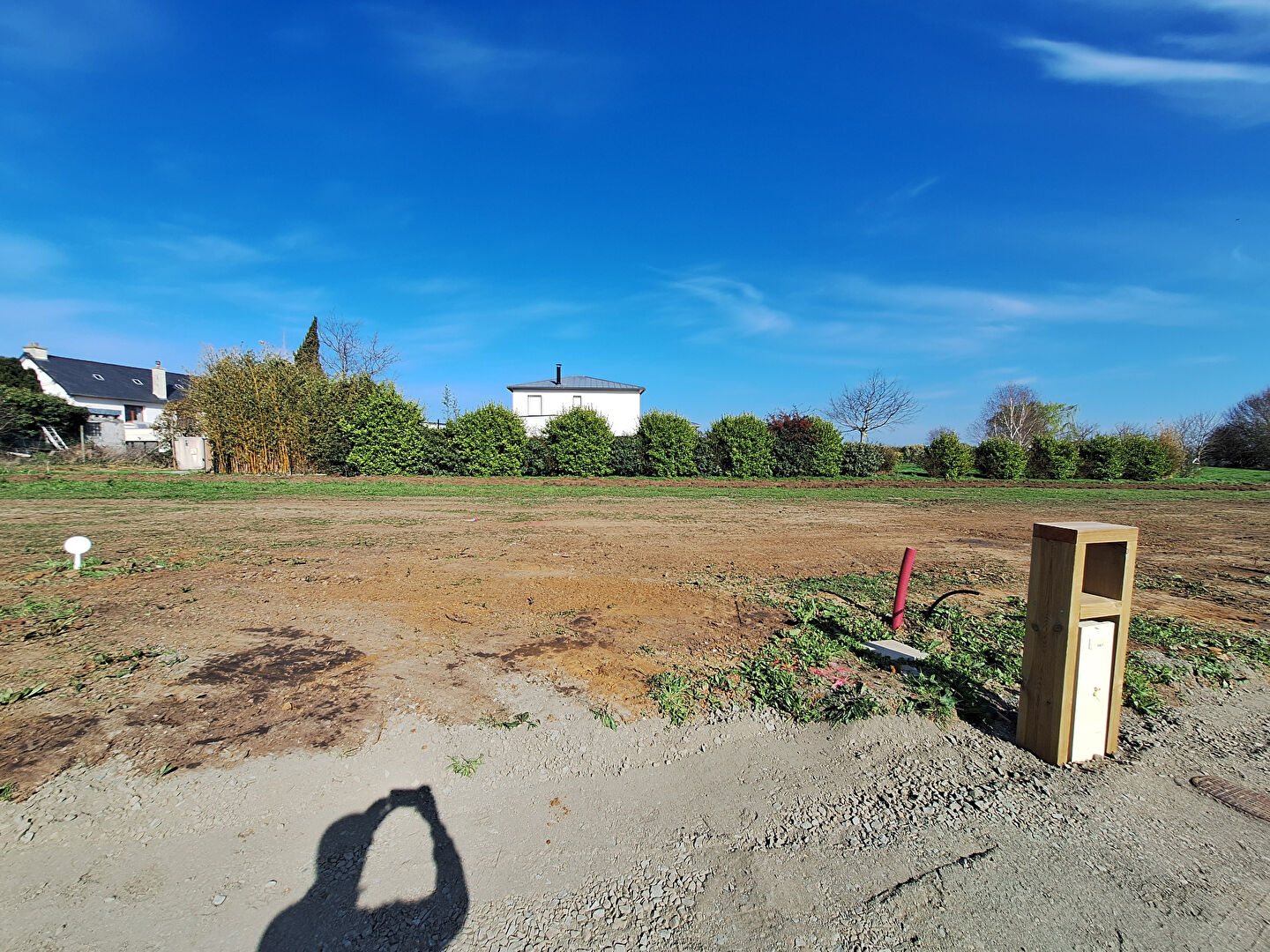 Terrain borné et déjà viabilisé en eau, raccordé aux eaux usées et eaux pluviales.