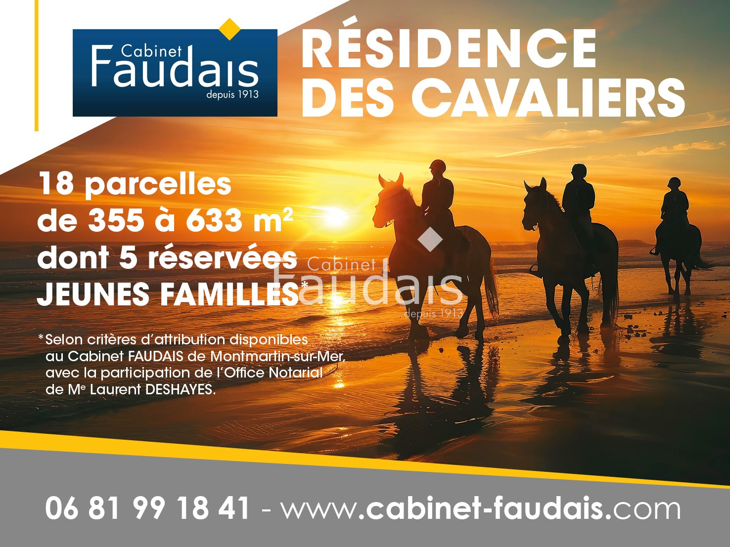 Située dans la charmante station balnéaire de Hauteville?sur?Mer, Le Cabinet Faudais vous présente LA RÉSIDENCE DES CAVALIERS : 18 parcelles de 355 à 633 m2, intégralement viabilisées, libres de constructeurs, à seulement 400 mètres des plages.