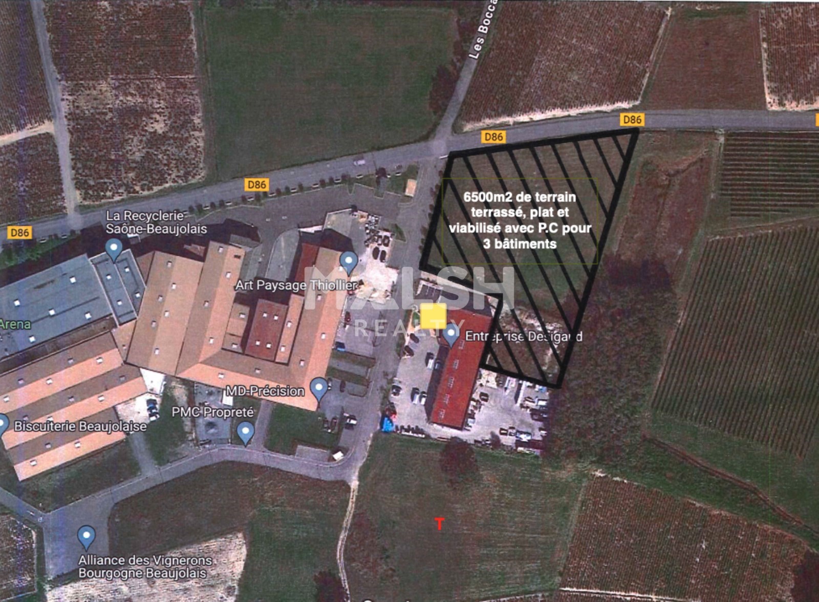 Entre Villefranche-sur-Saône et Mâcon, à l'entrée d'une Z.A nous vous proposons à la VENTE, un terrain terrassé, plat et viabilisé d'une surface d'environ 6 500 m² avec projet de construction de 3 bâtiments (environ 10 cellules prévues). Pe...