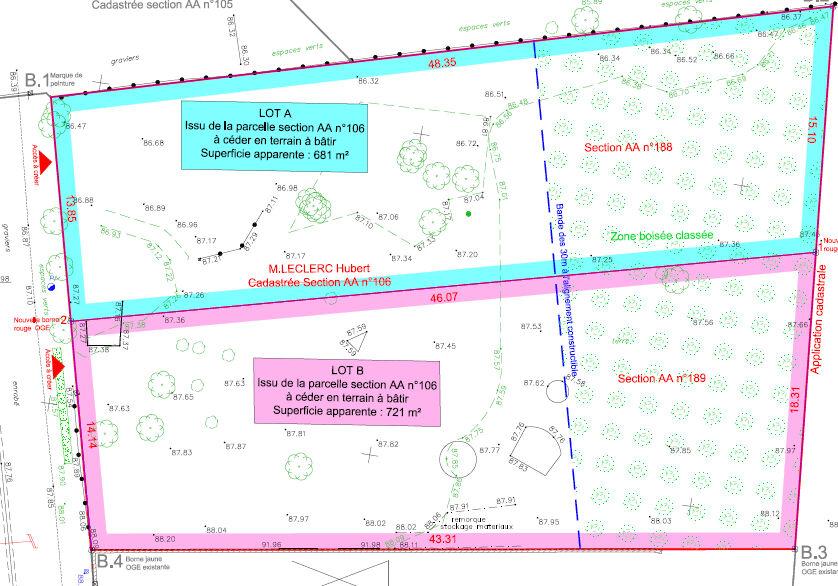 Lot B : superficie : 1127 m², façade : 13,93 m.