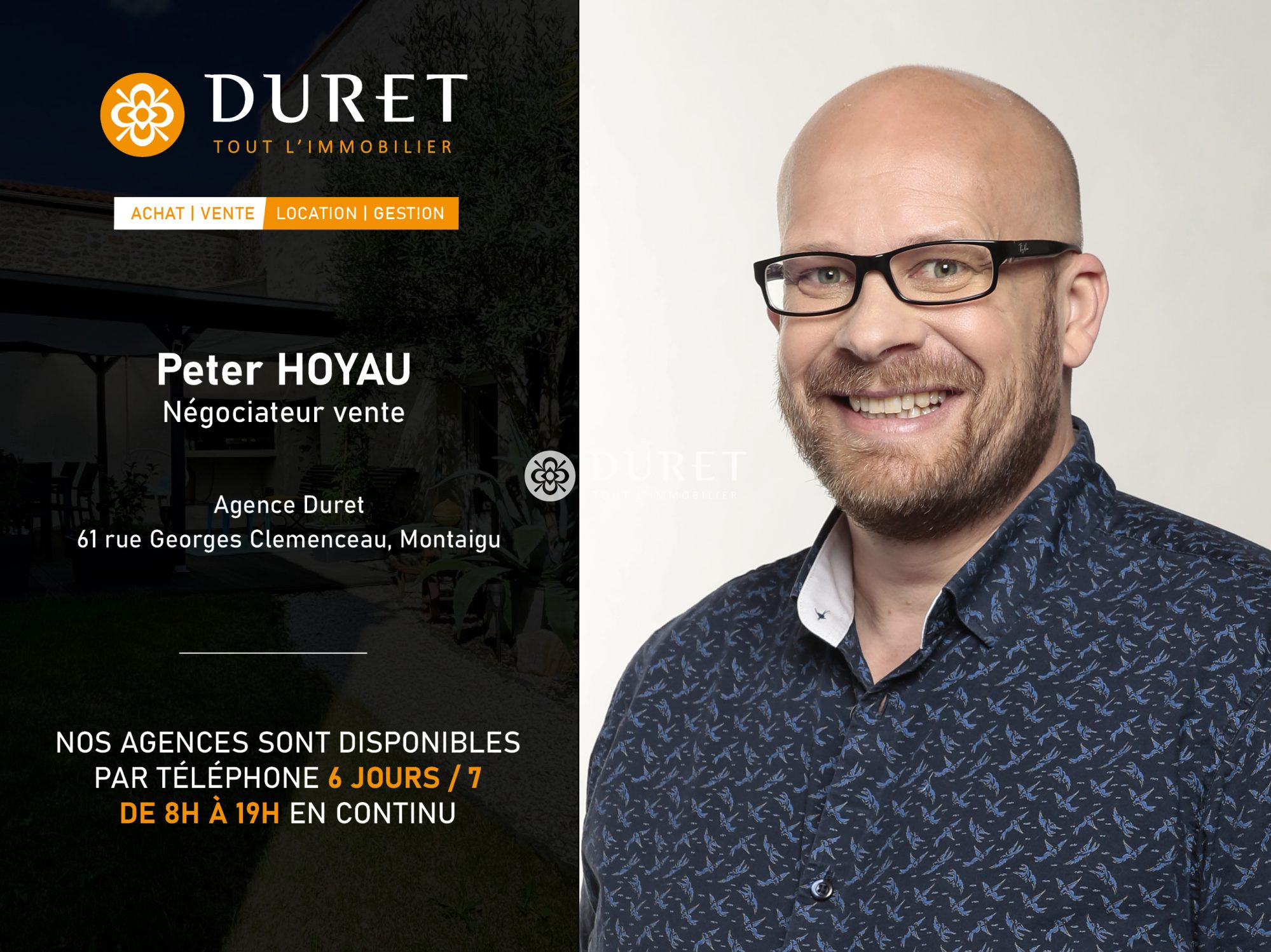 Nos agences immobilières Duret sont joignables par téléphone du lundi au samedi, de 8h00 à 19h00, sans interruption.