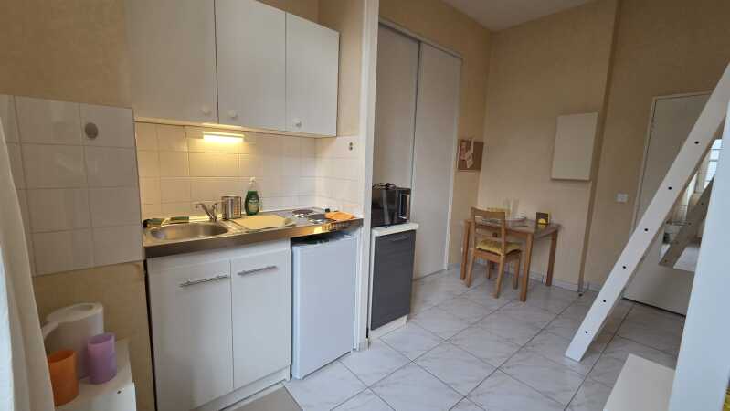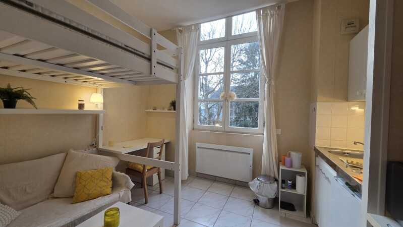 Rue Stanislas Julien, F1bis de 29m2 comprenant : entrée, salle de bains avec WC, séjour avec cuisine ouverte aménagée et équipée, chambre. Libre le 20 Avril 2026. Chauffage individuel éléctrique.