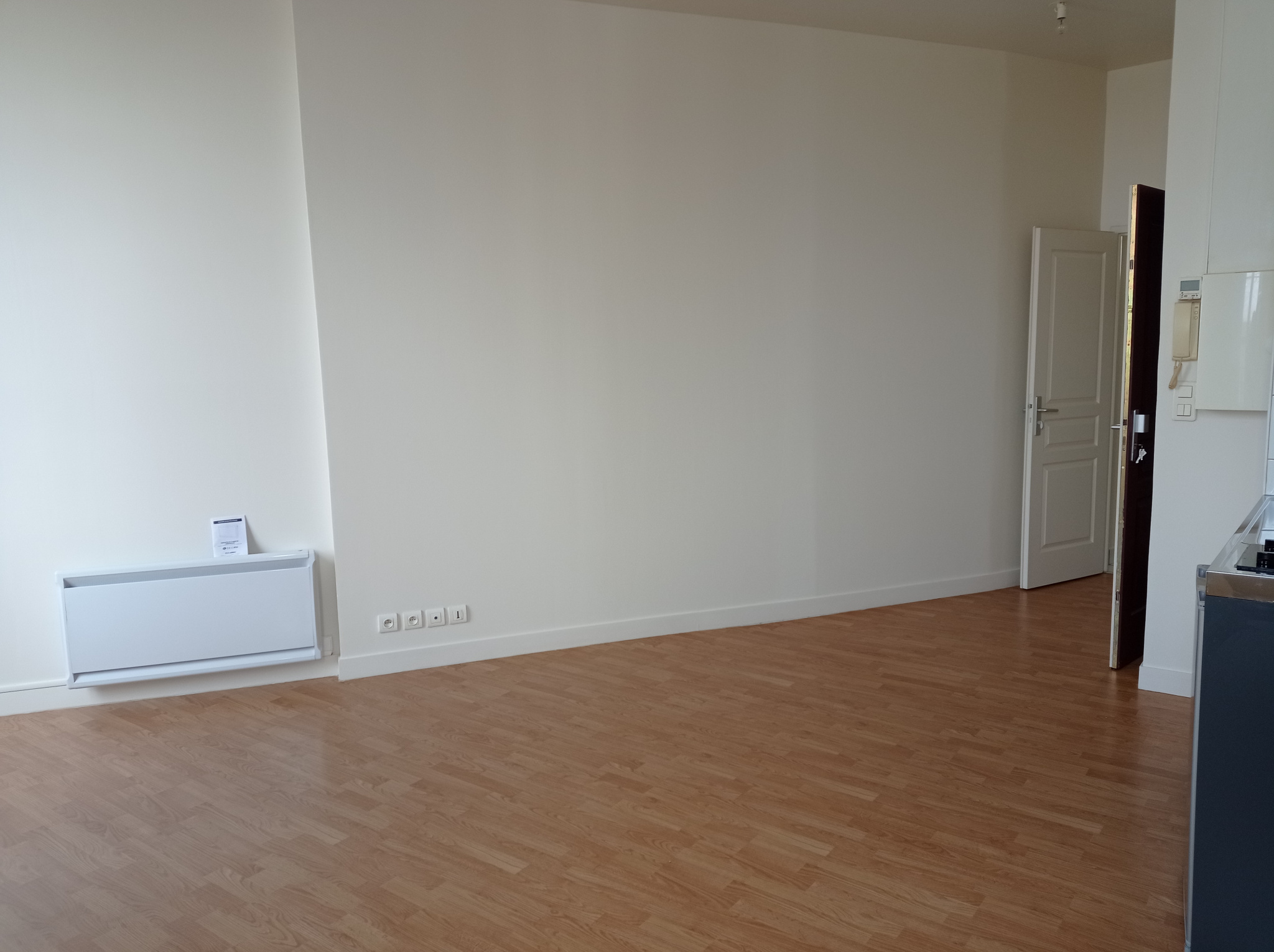 Entrée avec placard, séjour avec cuisine ouverte, salle d'eau, chambre.