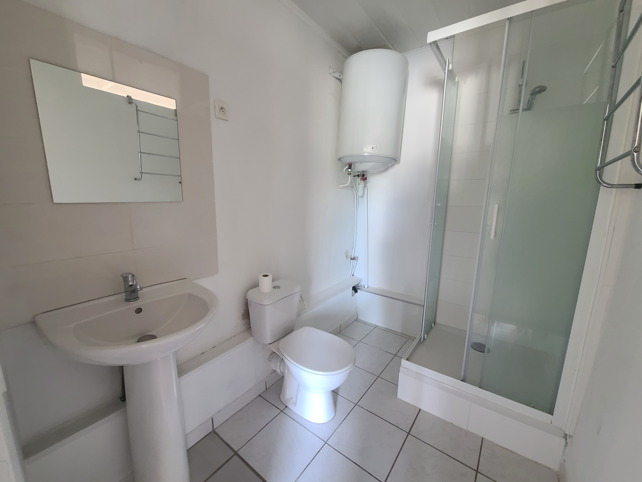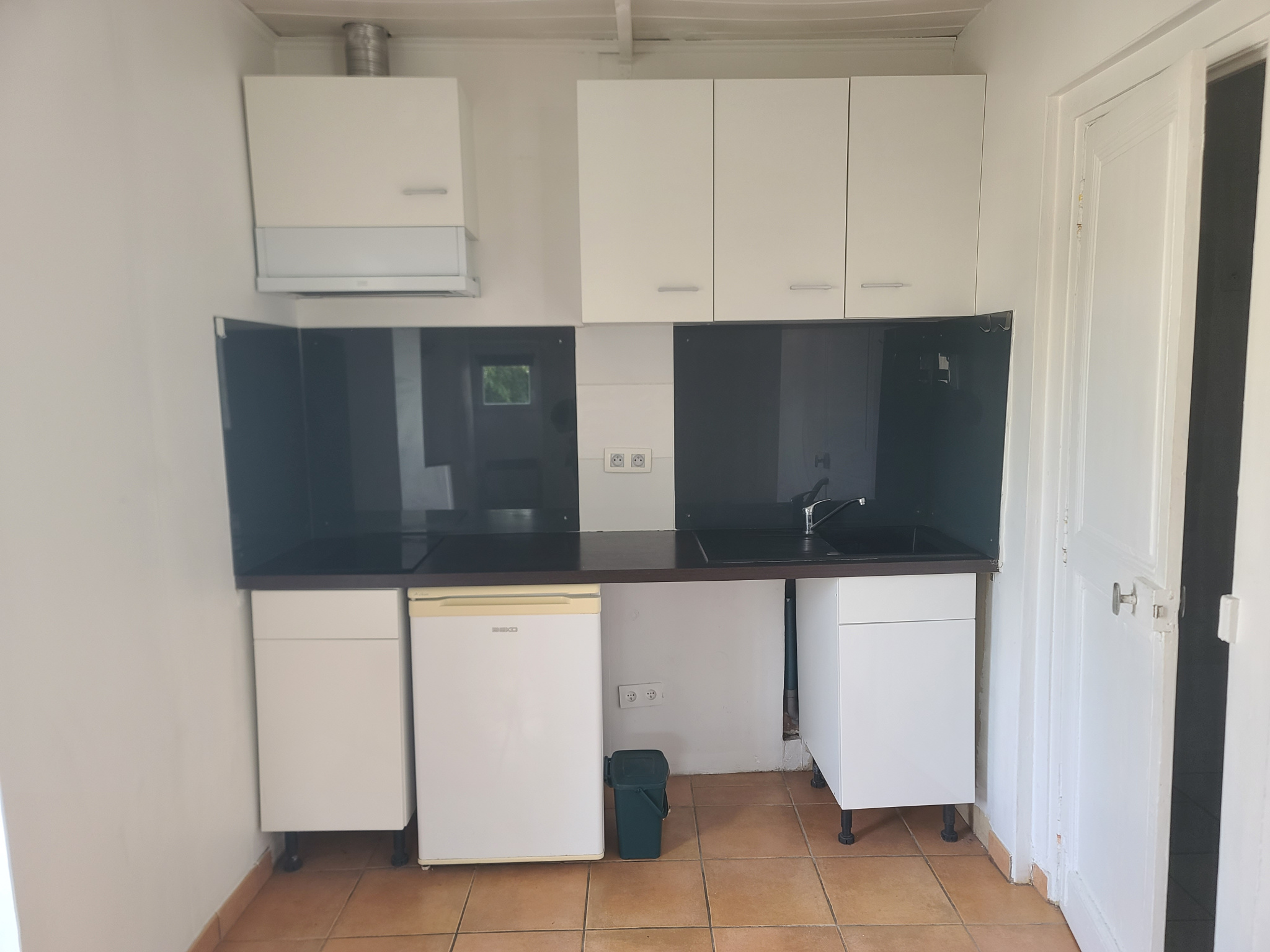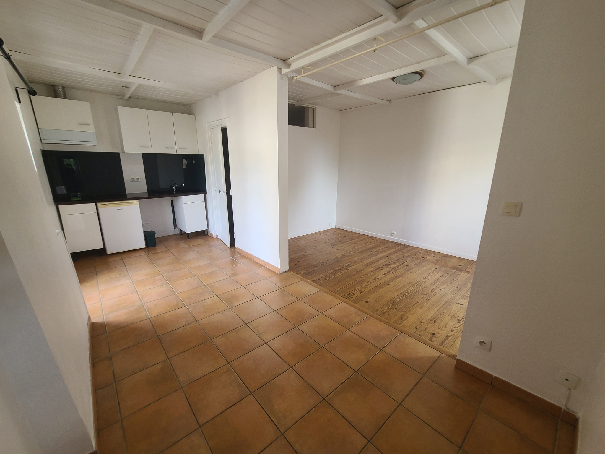 Appartement T1 au 1er étage, comprenant : un séjour avec coin cuisine équipée (hotte, plaque de cuisson, réfrégirateur), un coin nuit (ouvert sur le séjour), et une salle d'eau avec WC.