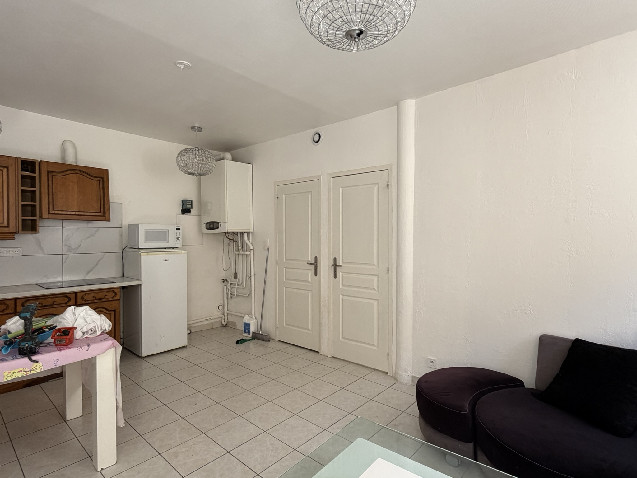 Cuisine aménagée ouverte sur séjour, chambre et salle d'eau / WC.