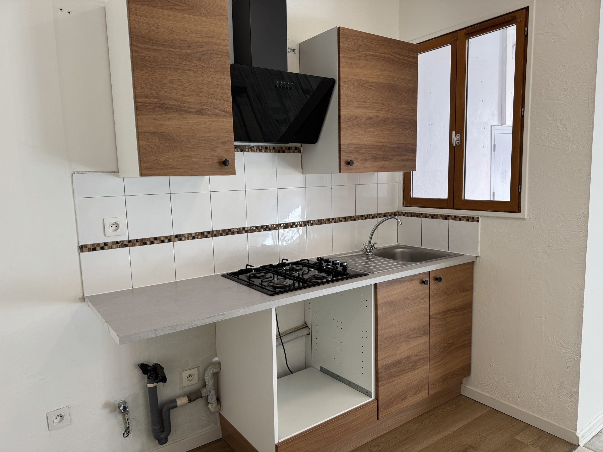 A LOUER- Appartement type T3 en duplex au premier étage d'un petit immeuble. Composé d'une belle pièce de vie avec cuisine ouverte ( semi-équipée: four, plaque, hotte). Au premier étage du duplex, 2 chambres et une salle d'eau avec WC.
