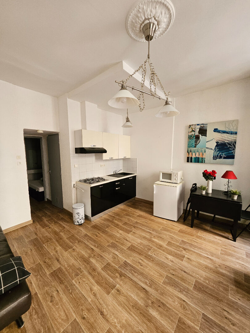 Au rez de chaussée d'un petit immeuble proche du centre ville, appartement comprenant une pièce à vivre avec cuisine ouverte aménagée, une salle d'eau, et une chambre avec placard.