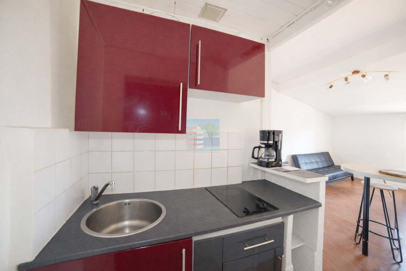 A louer, appartement 2 pièces climatisé au 1er étage composé d'une cuisine équipée ouverte sur séjour, une chambre avec placard, salle de bain et WC séparé.