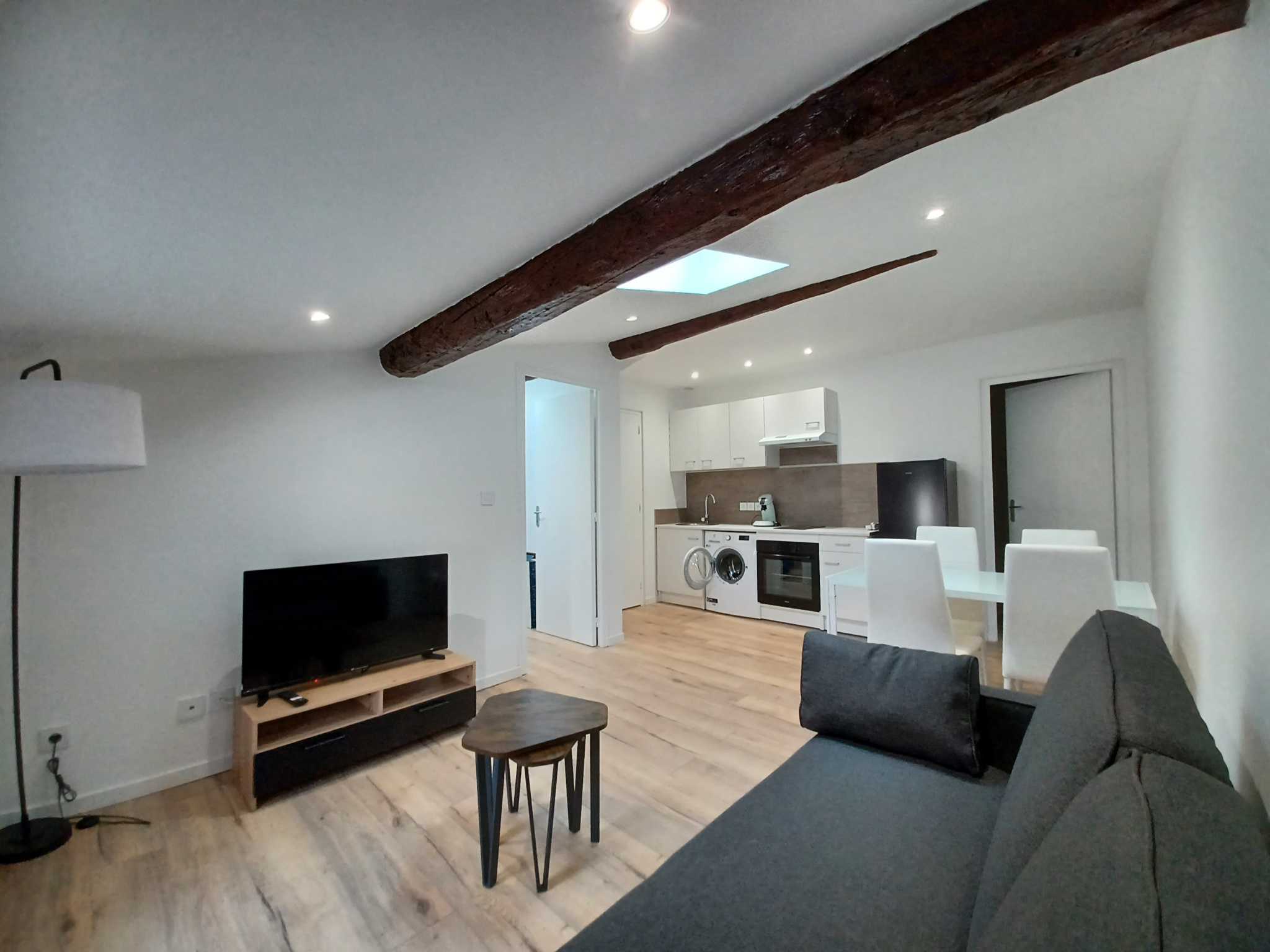 Appartement 1 pièce de 33,88 m² situé à Narbonne, au premier étage sans ascenseur, dans un immeuble ancien entièrement rénové à neuf tout en conservant le charme de l'ancien.