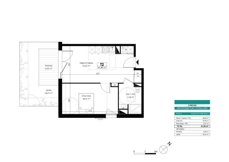 Il se compose d'une entrée, un séjour ouvert sur une cuisine aménagée et semi-équipée (hotte et plaque vitrocéramique), 2 ...