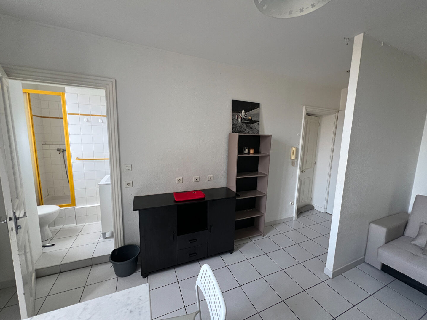 Appartement une pièce, au 1er étage d'un immeuble composé d'une pièce principale avec kitchenette (hotte aspirante, plaques de cuisson, réfrigérateur) et d'une salle d'eau avec WC.