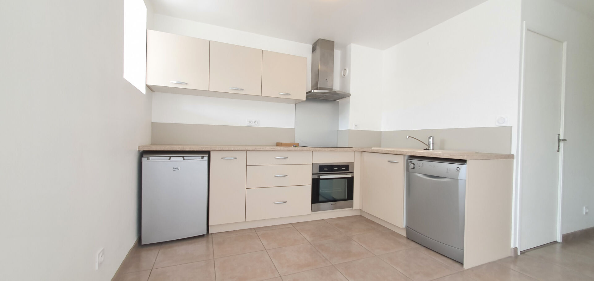 RC : une cuisine équipée (placards hauts , bas, hotte aspirante, four à pyrolyse, plaque de cuisson vitrocéramique, frigidaire) ouverte sur le séjour exposé Ouest, salle d'eau aménagée (douche ...