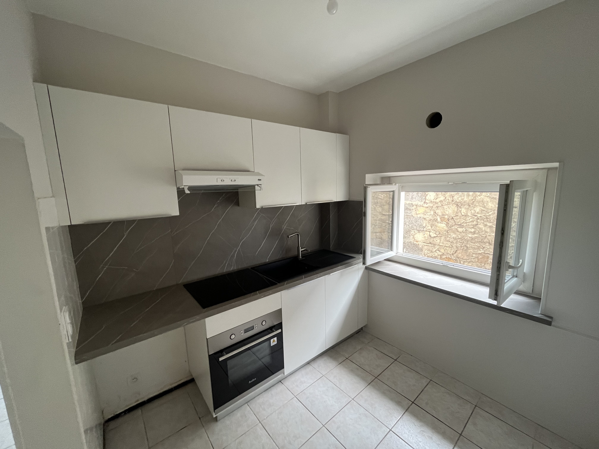 BOZOULS : Déco contemporaine pour ce T3 rénové comprenant un hall d'entrée avec placard, un séjour avec une cuisine ouverte (meubles hauts , bas, hotte, plaque induction, four), deux chambres dont une avec un placard, une salle d'eau aménagée, un WC...