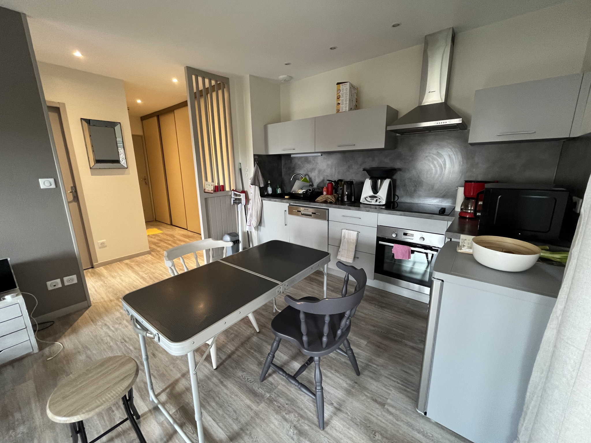 RODEZ : T2 lumineux comprenant un hall d'entrée avec un placard aménagé, une cuisine équipée (meubles hauts et bas, plaque de cuisson induction, four à pyrolyse, micro ondes, hotte aspirante, frigidaire congélateur, lave-vaisselle) ouverte sur le séjour ...