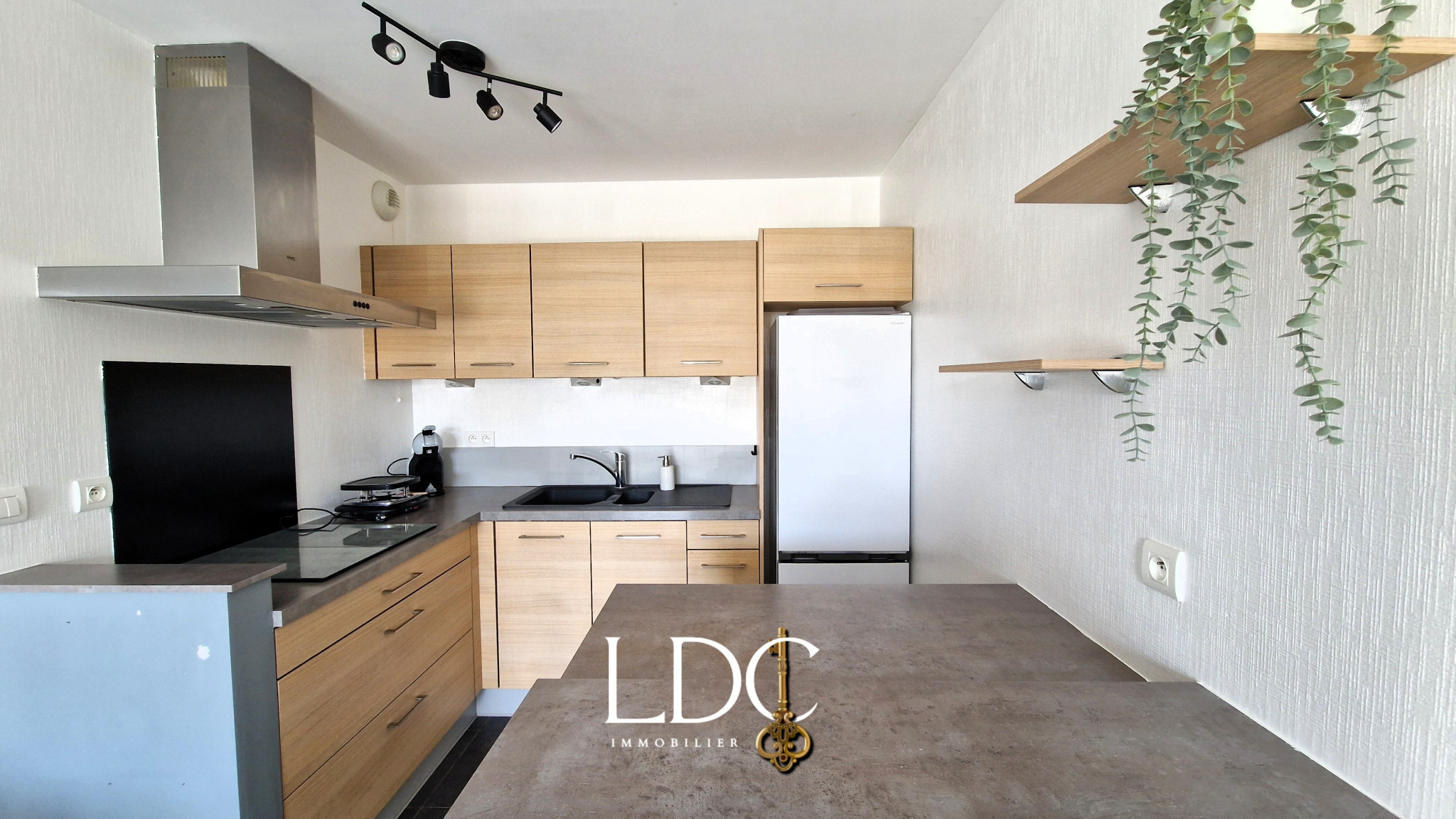 Cuisine ouverte sur séjour avec évier, frigo, 2 plaques de cuisson, rangements.